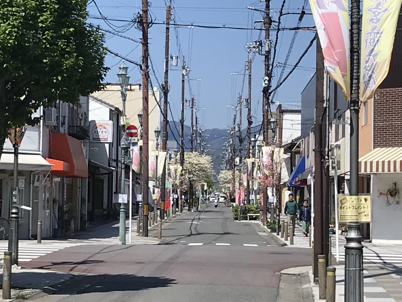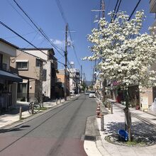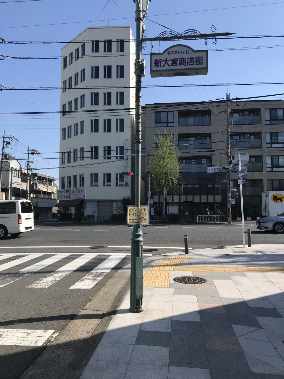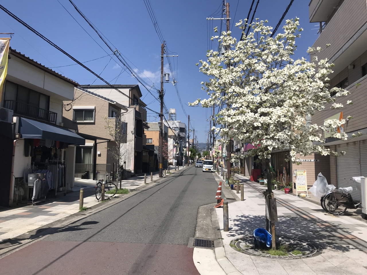 新大宮商店街は新大宮通の北山から北大路までの約1㎞続く一番長い商店街です。アーケードはなく、商店や飲食店が軒を連ねています。建物の高さが揃っているのは何か理由があるのでしょうか。車は南行きの一方通行になっていて、地元に根付いた商店街といった感じがしました。歩道はきれいに整備されていて、花を楽しめる街路樹が植えてありました。