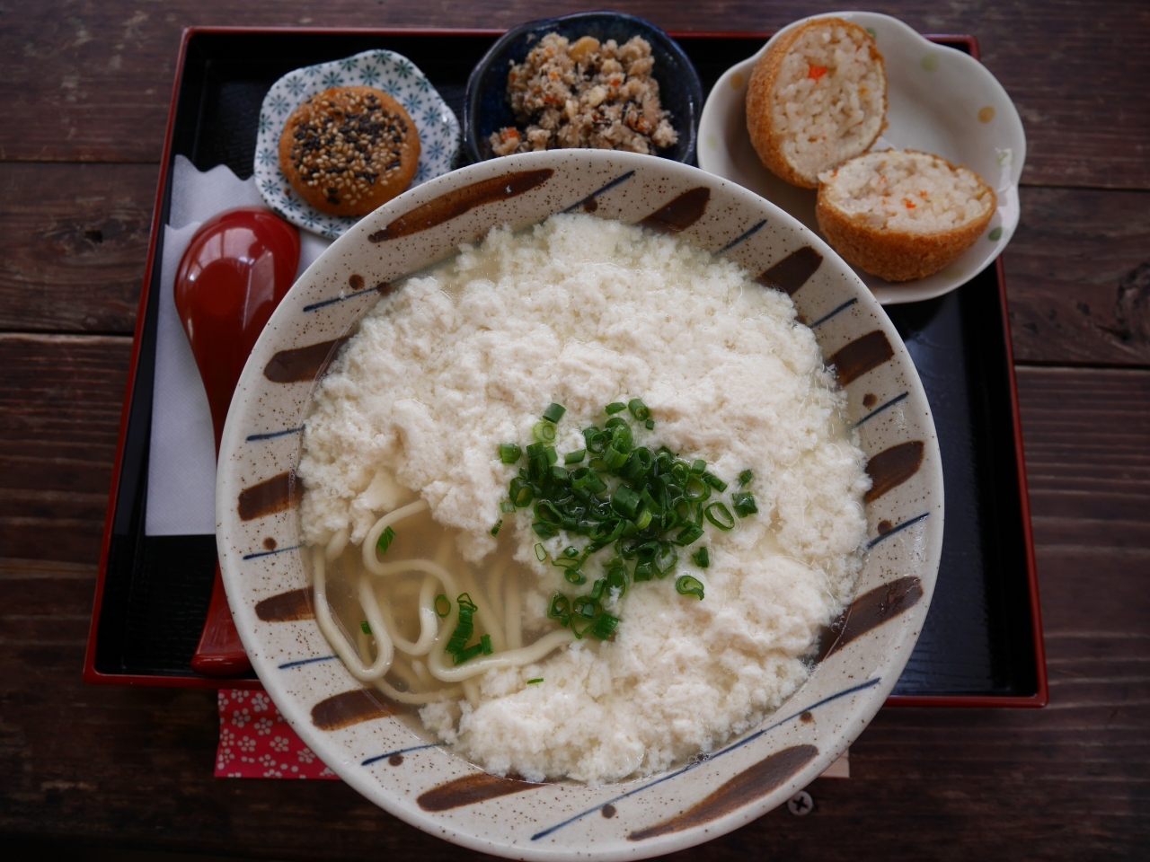 「ゆし豆腐そばセット」はゆし豆腐そばに豆腐おにぎりとおからと甘いお餅がついてきます。右奥の豆腐おにぎりの中身はジューシーにしました。