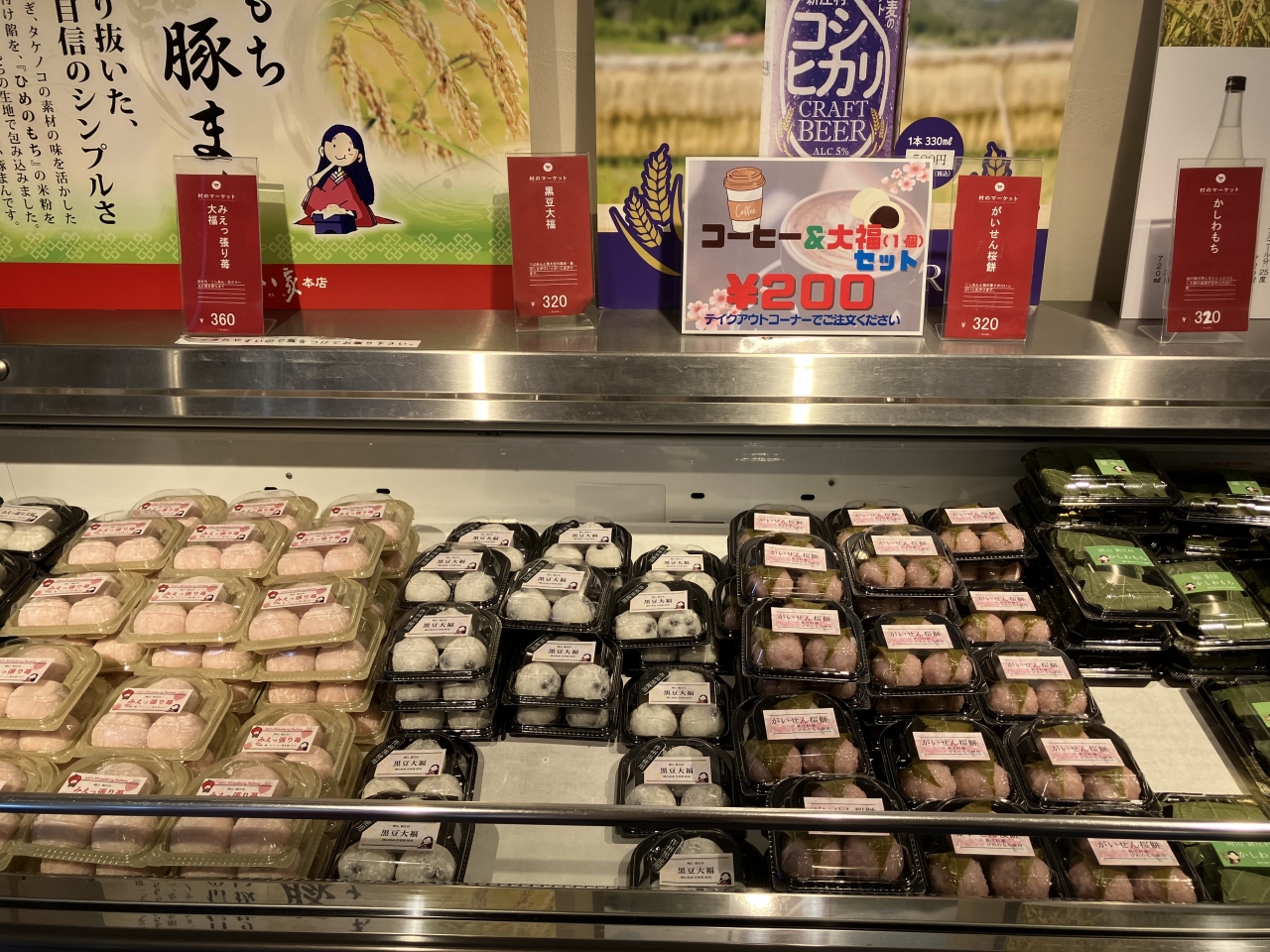 新庄宿のがいせん桜を見に行く時此処に駐車しました。直売所には色々な物産品が有りましたが、この地域は餅米の産地という事で各種のお餅や大福餅が目立っていました。“コーヒーと大福セット”を200円で売っていましたよ。