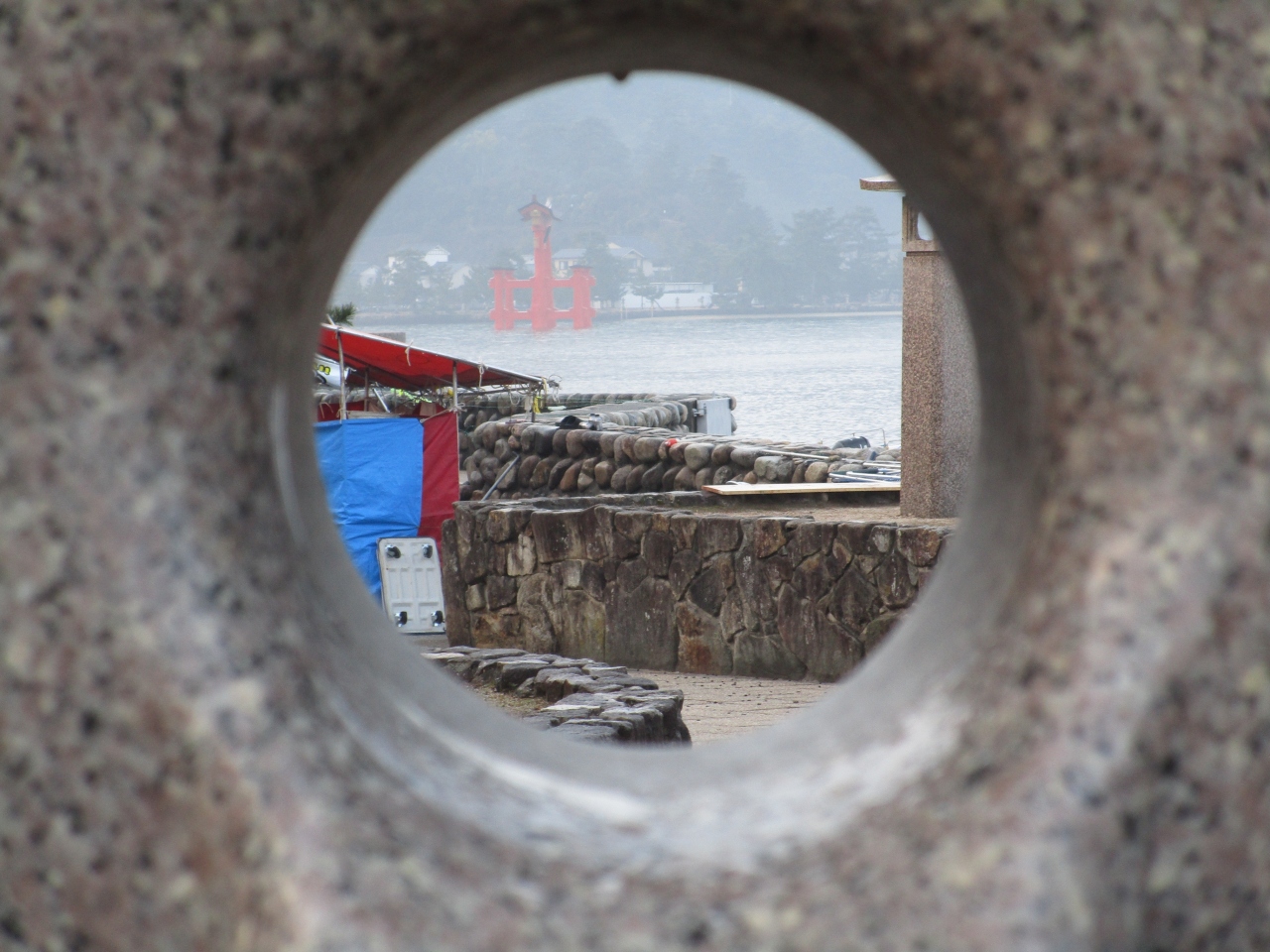 御笠浜は厳島神社の参道となっているため、石灯籠が多く並んでおり、丸い穴に大鳥居をいれて撮影できる世界遺産登録記念碑もありました。