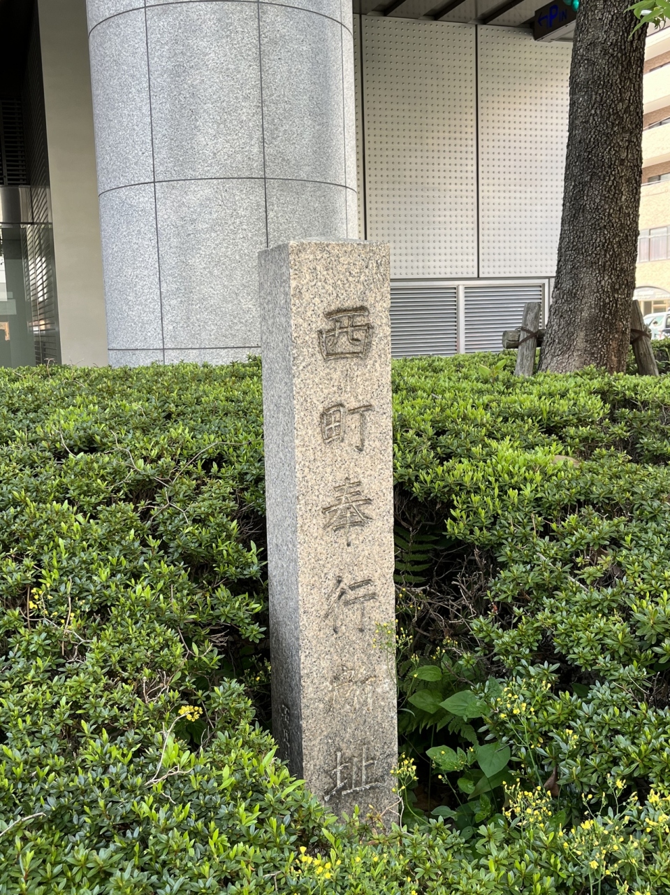 西町奉行所あとの石碑は、マイドーム大阪の敷地にあるのですが、実は二つあります。建物の横の石碑には、「西町奉行所跡」と書かれていて、正面入り口の植え込みの石碑には、「西町奉行所址」と書かれています。この違いは何でしょうね。