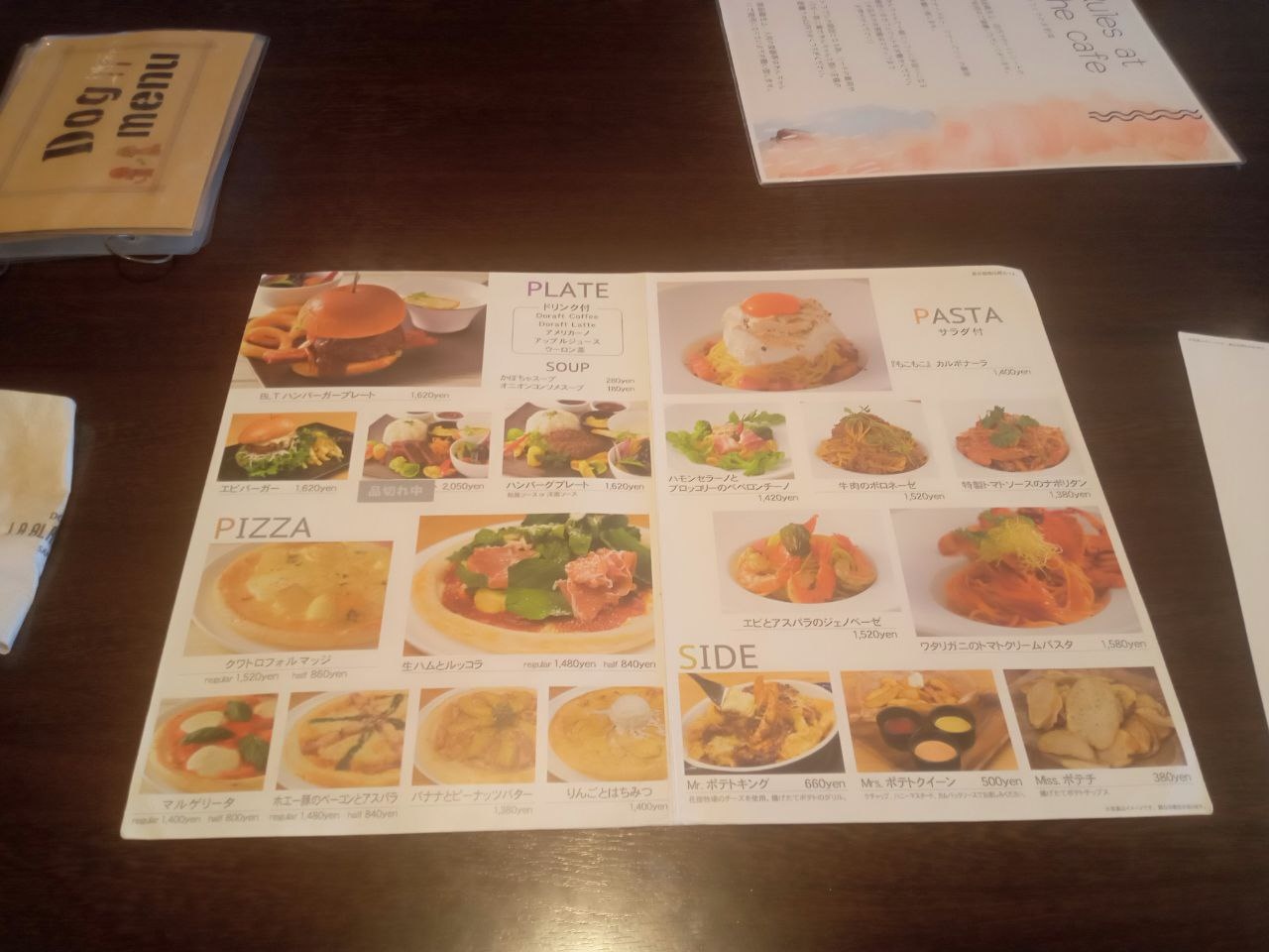 ワンちゃんと入れるドッグカフェ。洋食メニュー豊富な印象です
