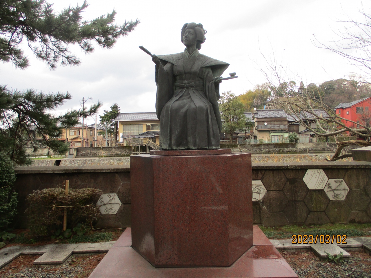 浅野川にかかる風流な「梅の橋」のたもとに碑と着物姿の女性の像があります。これは泉鏡花の出世作「義血侠血」のヒロイン・滝の白糸です。滝の白糸は鏡花が生涯をかけて追求した理想の女性像でもあったそうです。