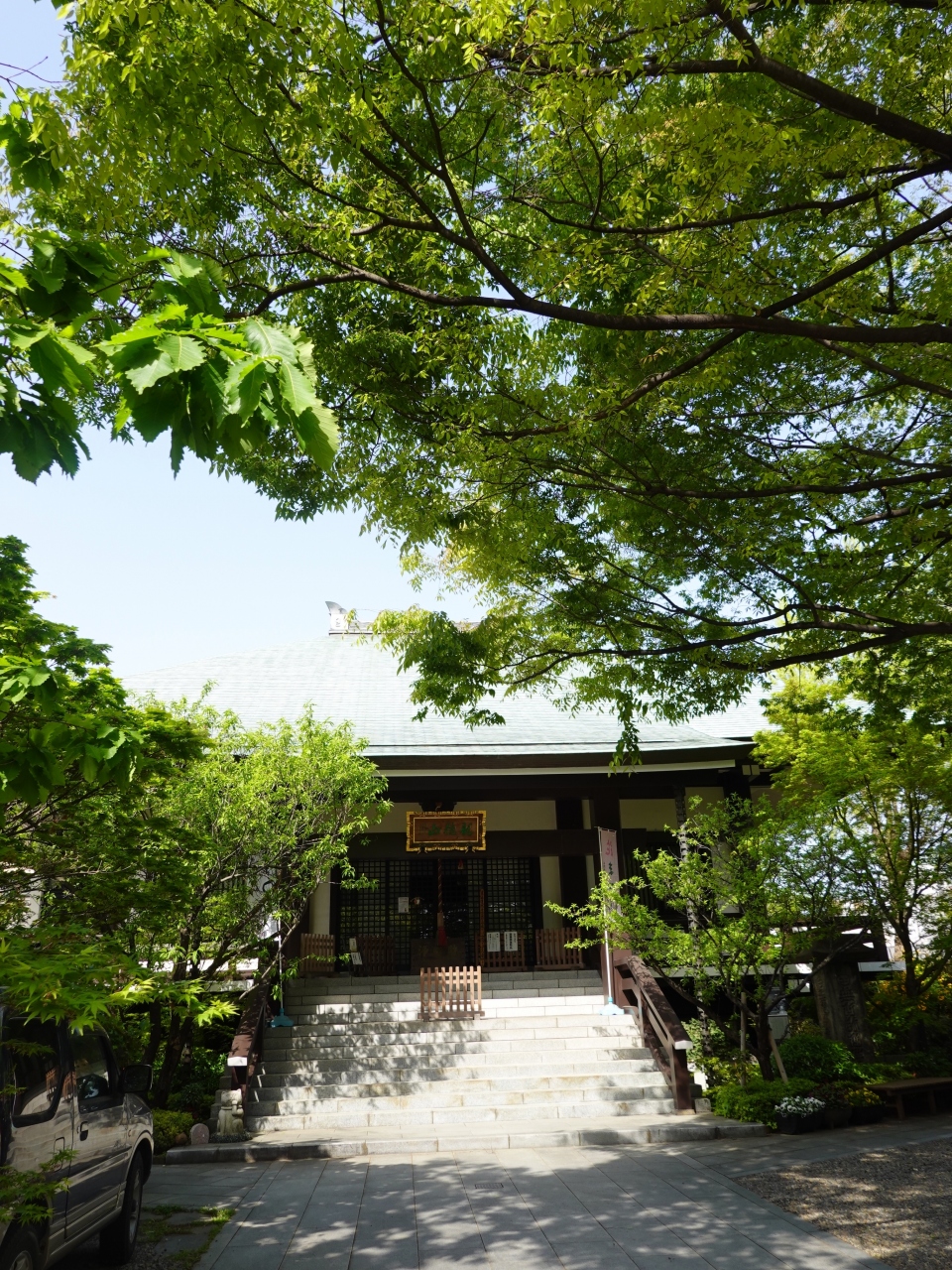 4月、木場の東京都現代美術館から清澄庭園の方へ向かう途中本堂の前の新緑の眩しいお寺が見えてきます。門前には阿茶の局のお墓がある案内の石碑がありました。ご本尊は阿弥陀如来で徳川家公の側室、阿茶局の菩提寺として、1611年阿茶の局自らの発願により開創されたそうです。
