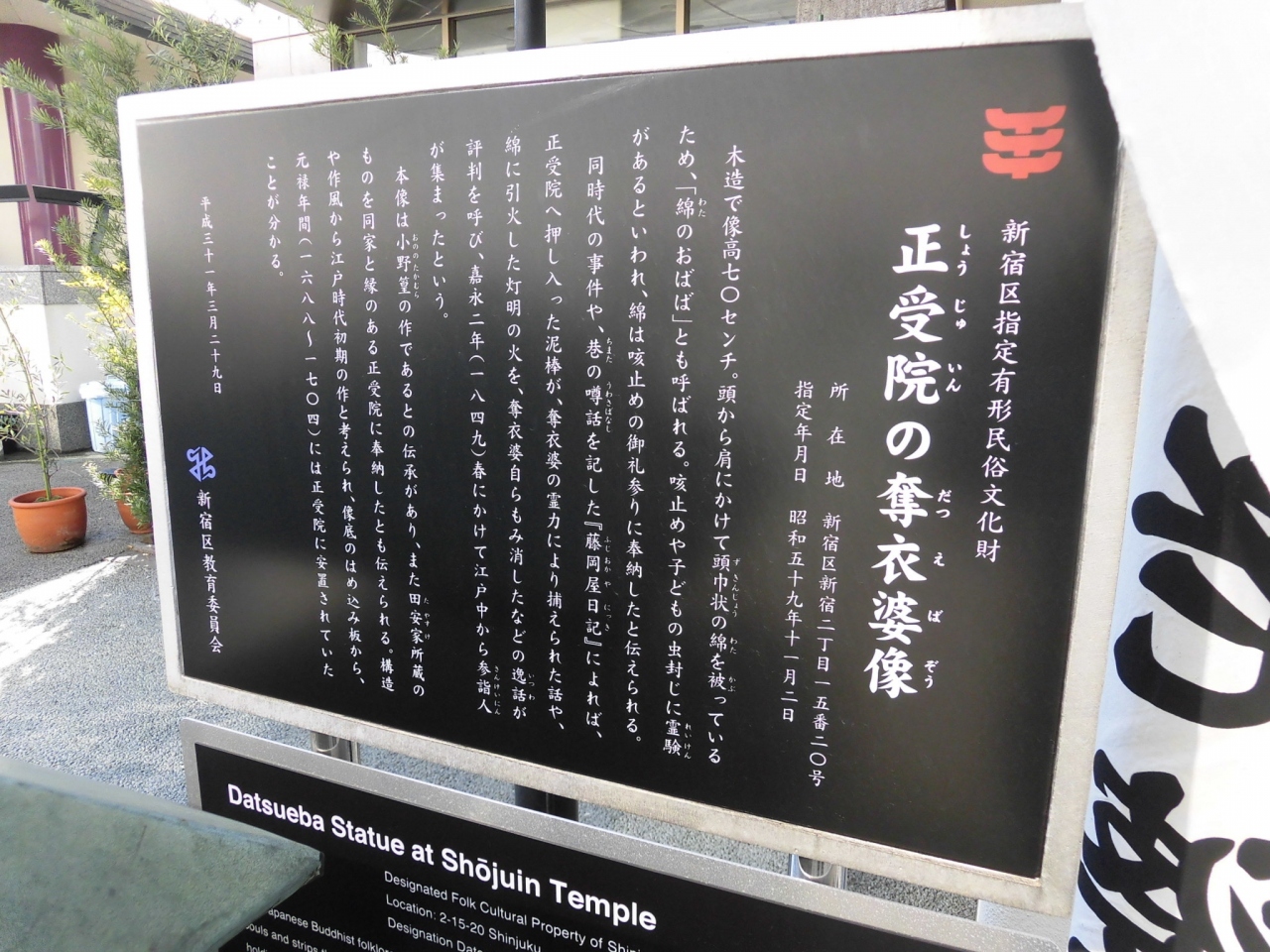 新宿2丁目近辺を散策していた時に立ち寄ったお寺です。入口は門扉付きのコンクリート製になっていて、どこかの会社の敷地に入るような感じです。本堂とは別にお社があって、案内板も立てられていて、中には奪衣婆像が祀られていました。頭から綿を被った姿は、霊験あらたかそうな柔らかいお顔でした。