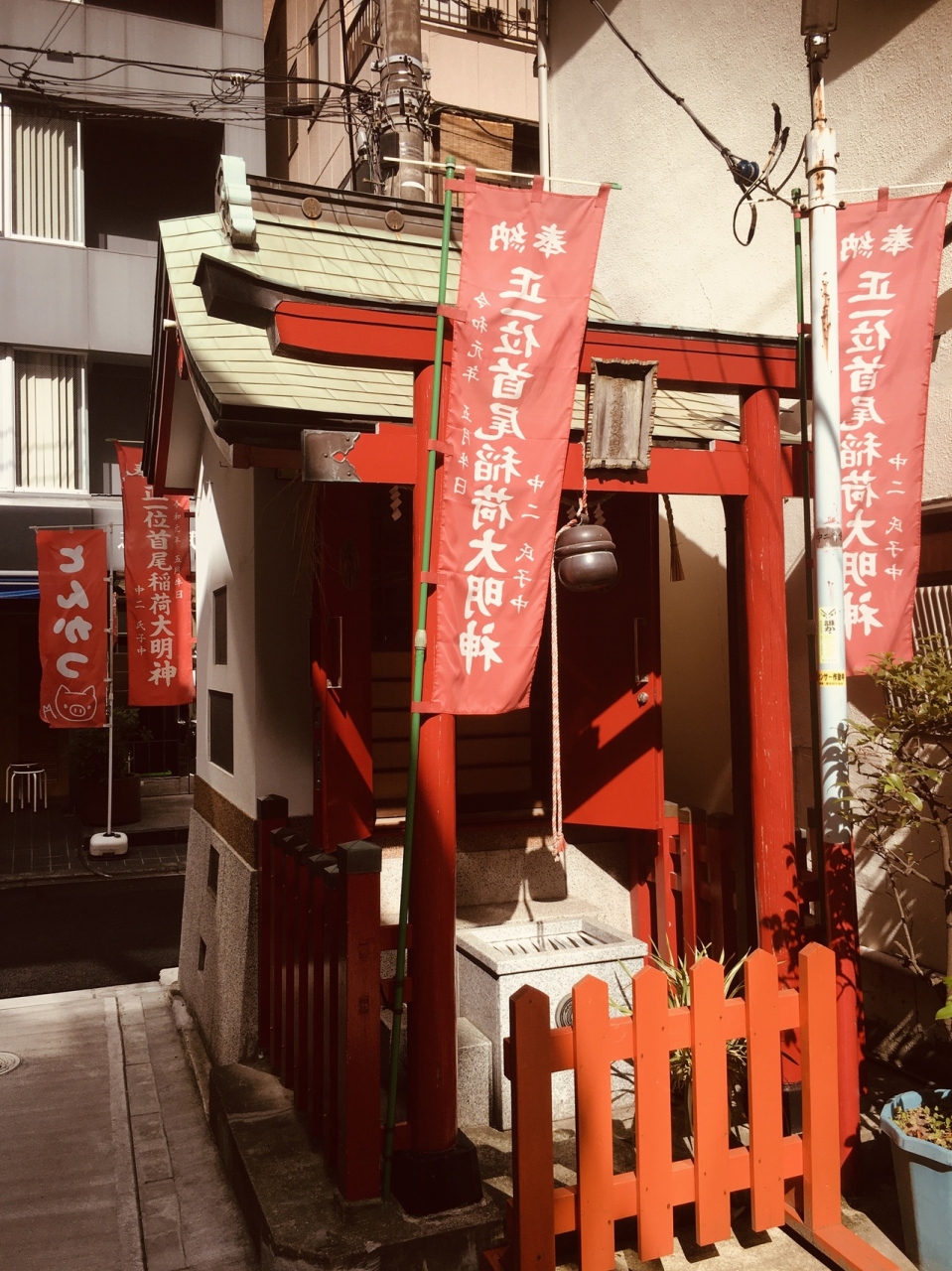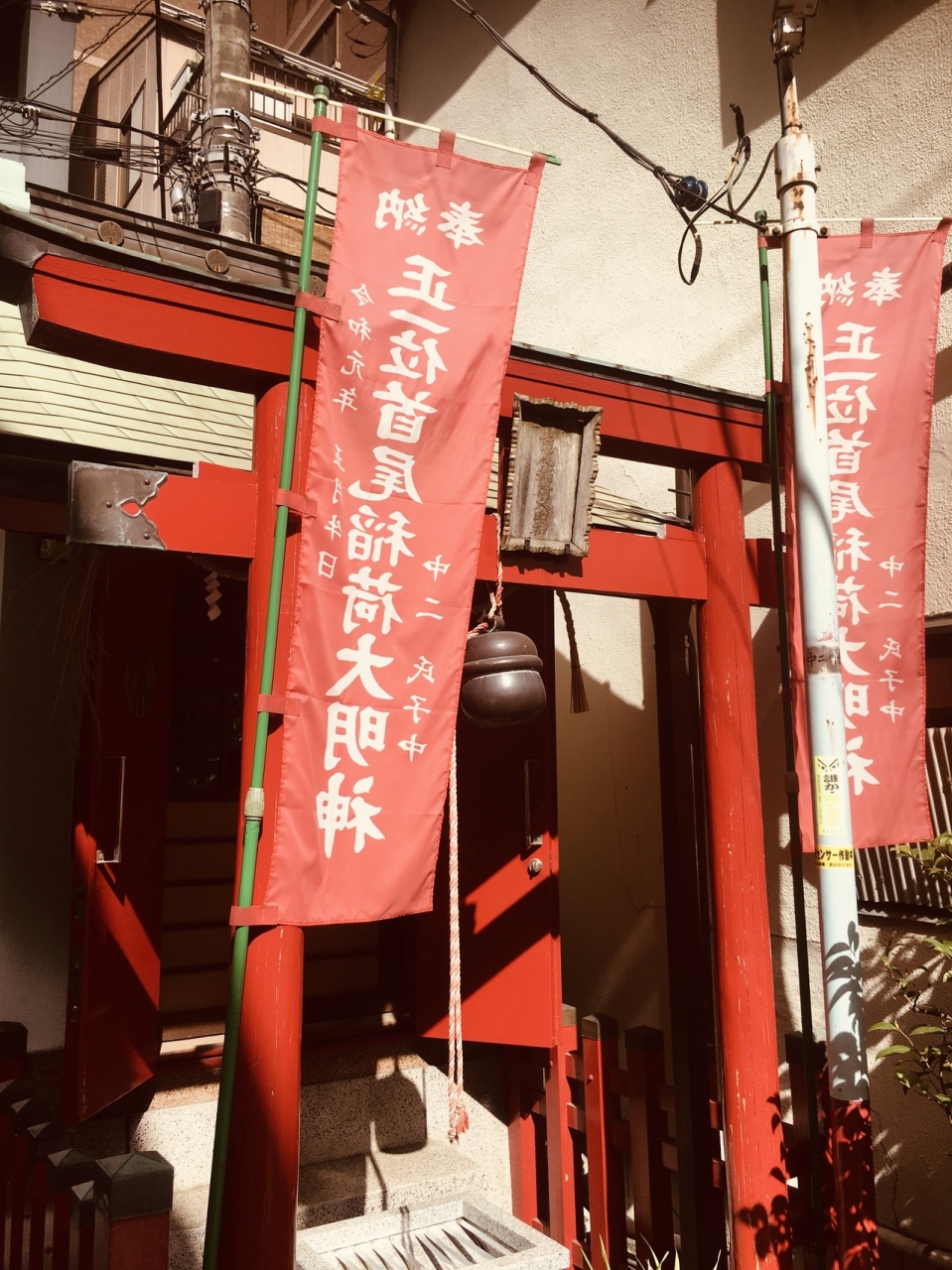 尾崎紅葉生誕の地でもあります。境内はなく、細い裏道沿いにひっそりと建っていました。赤い鳥居がいくつか靡き、鳥居の赤い色が眩しかったです。大きな鈴がぶら下がり、賽銭箱もあり、意外と参拝する人も何人か見かけました。