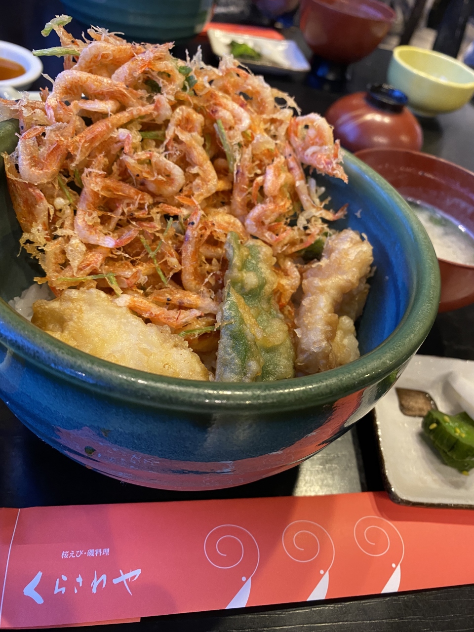 以前食べた桜えびかき揚げ丼というものはなくなり、しずまえ天丼と変わっていました。桜えびのかき揚げ1枚と魚のかき揚げなどがついてました。生桜えびも食べれて満足です。