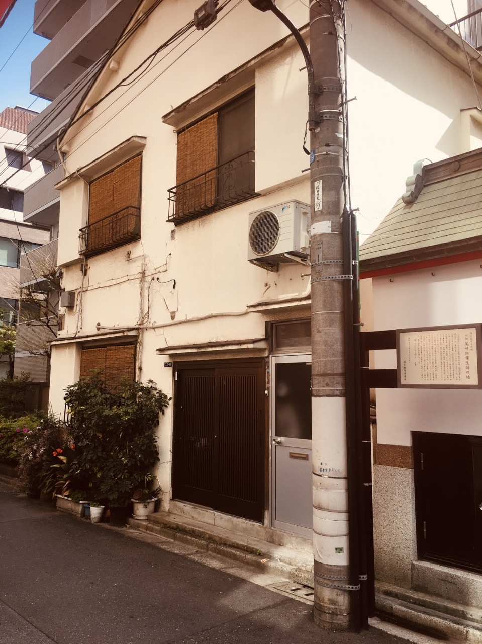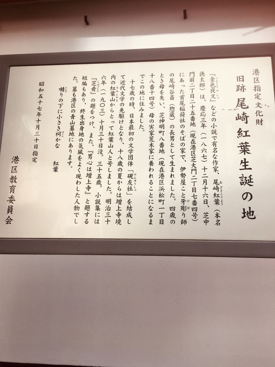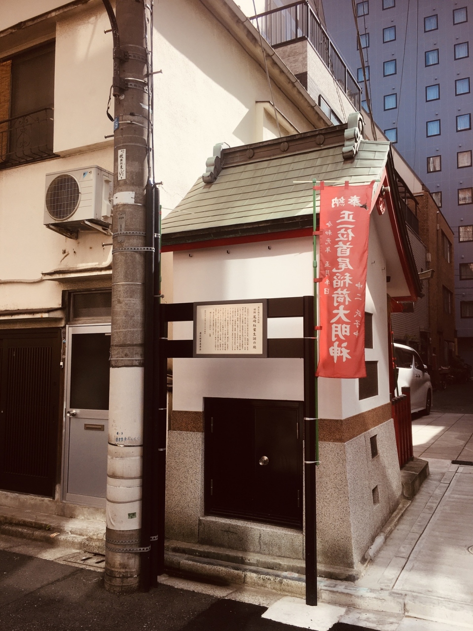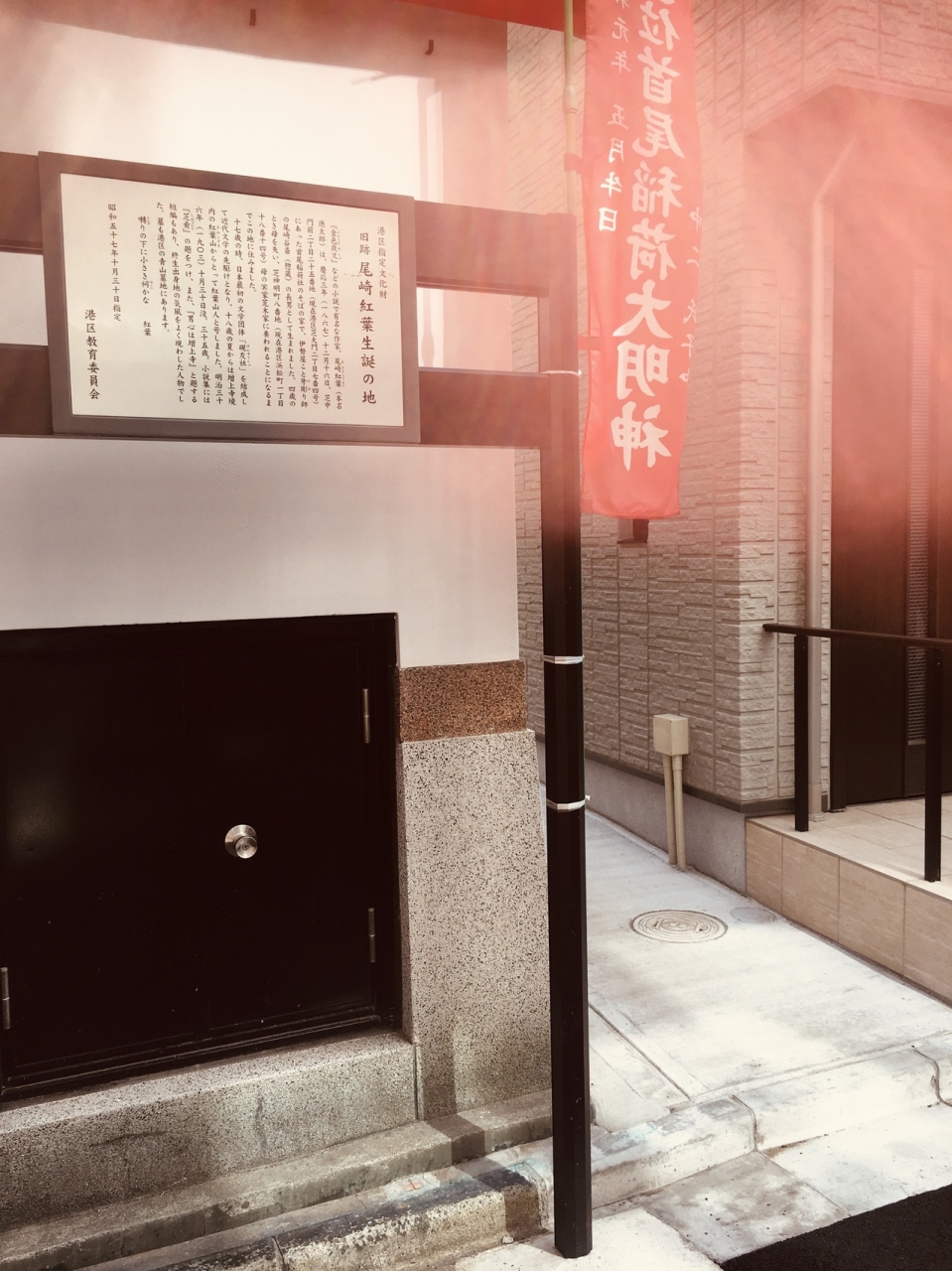 細い道沿いにある首尾稲荷大明神の祠の裏側に看板を立てかけたようなものがありました。前にはとんかつ屋の赤い幟か靡いていました。港区の指定文化財で、生い立ち等が記載してありました。周りは古くからあるような住宅街でした。
