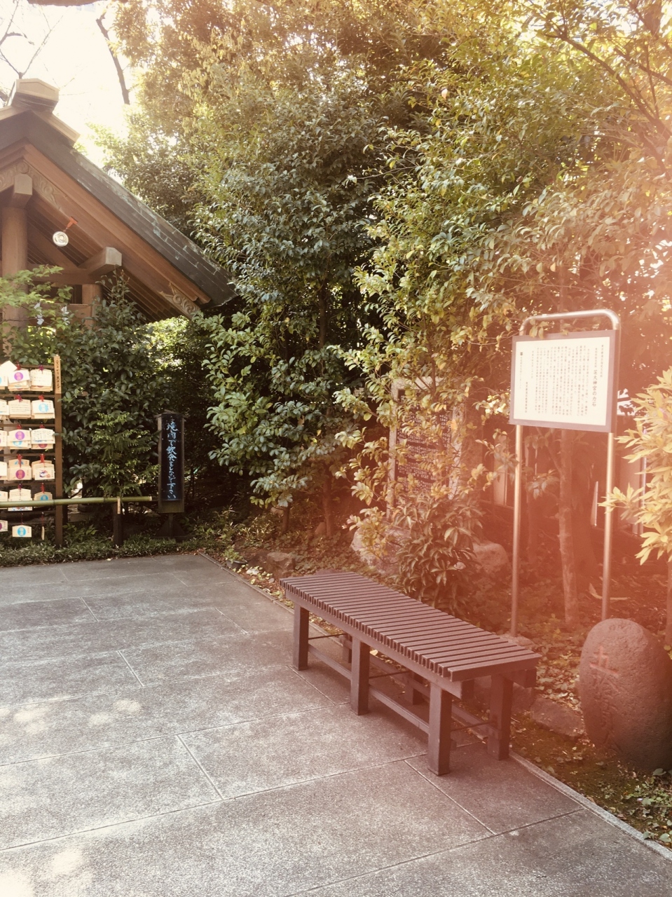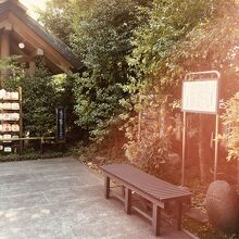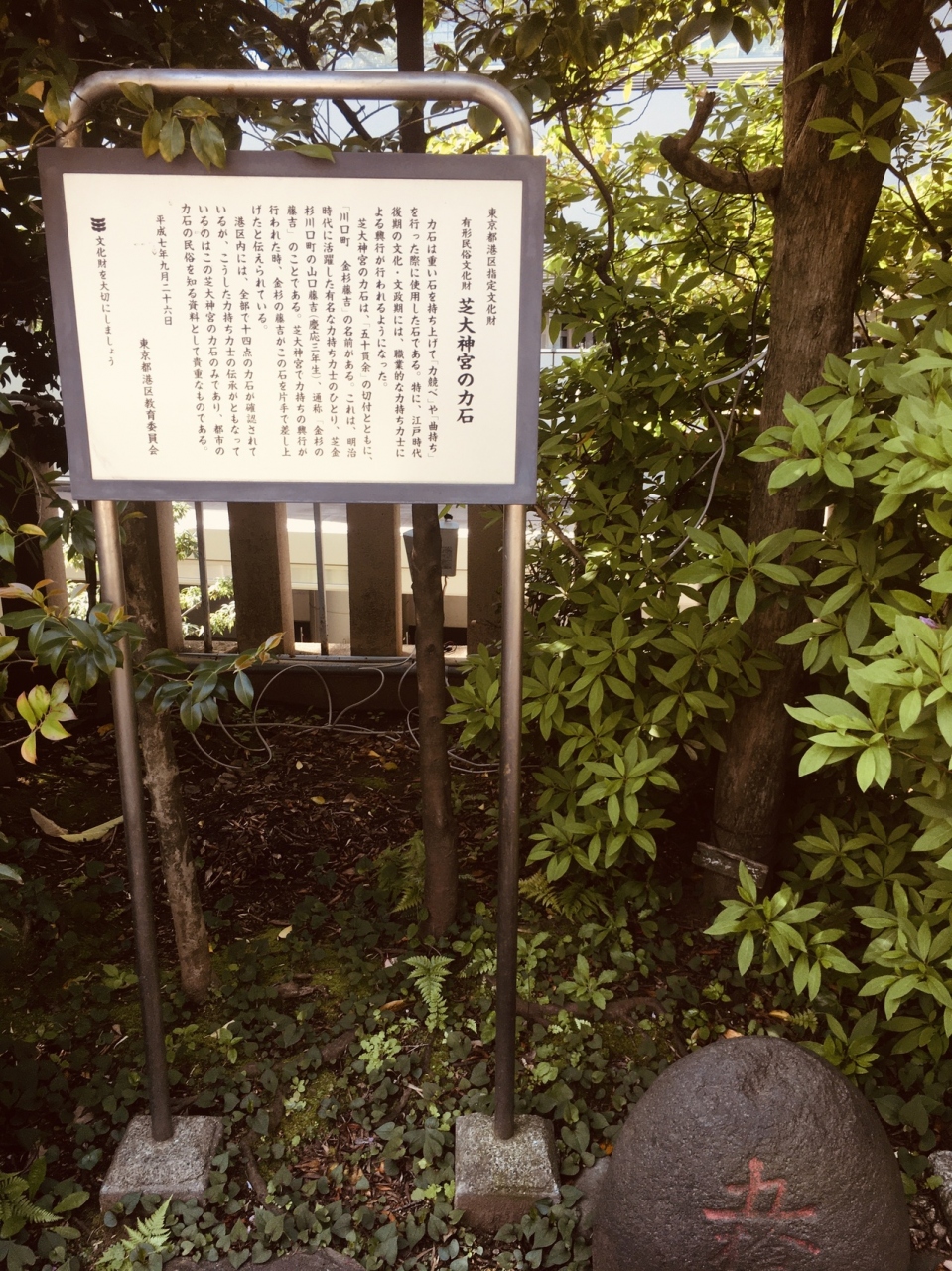 境内に入ると左側にあります。地面に置いてあるような配置で、おむすび型のツルツルの石で、赤い文字も記載してありました。意外と小さめで、両手で持ち上げられそうな感じがしました。前には椅子があり、横には看板があります。