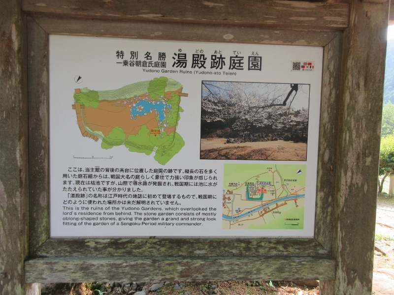 朝倉館の上にある庭園跡で、石がたくさん残っていました。湯殿跡庭園となっていますが、当時はどのように使われていたのかはまだわかっていないとのことです。高台にあるので見晴らしが良く、枯山水ではなく水も使われていたとのことで、心地が良い場所だったと思いました。