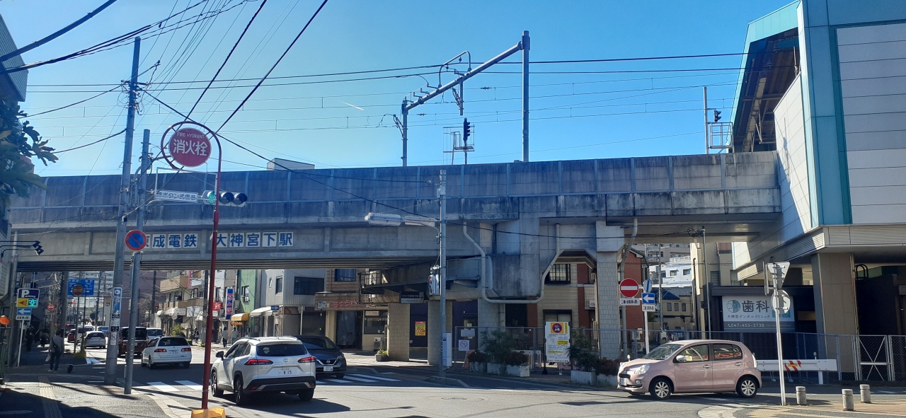 高架駅の出口を出ると船橋大神宮が見え、歩いて5分ほどです。