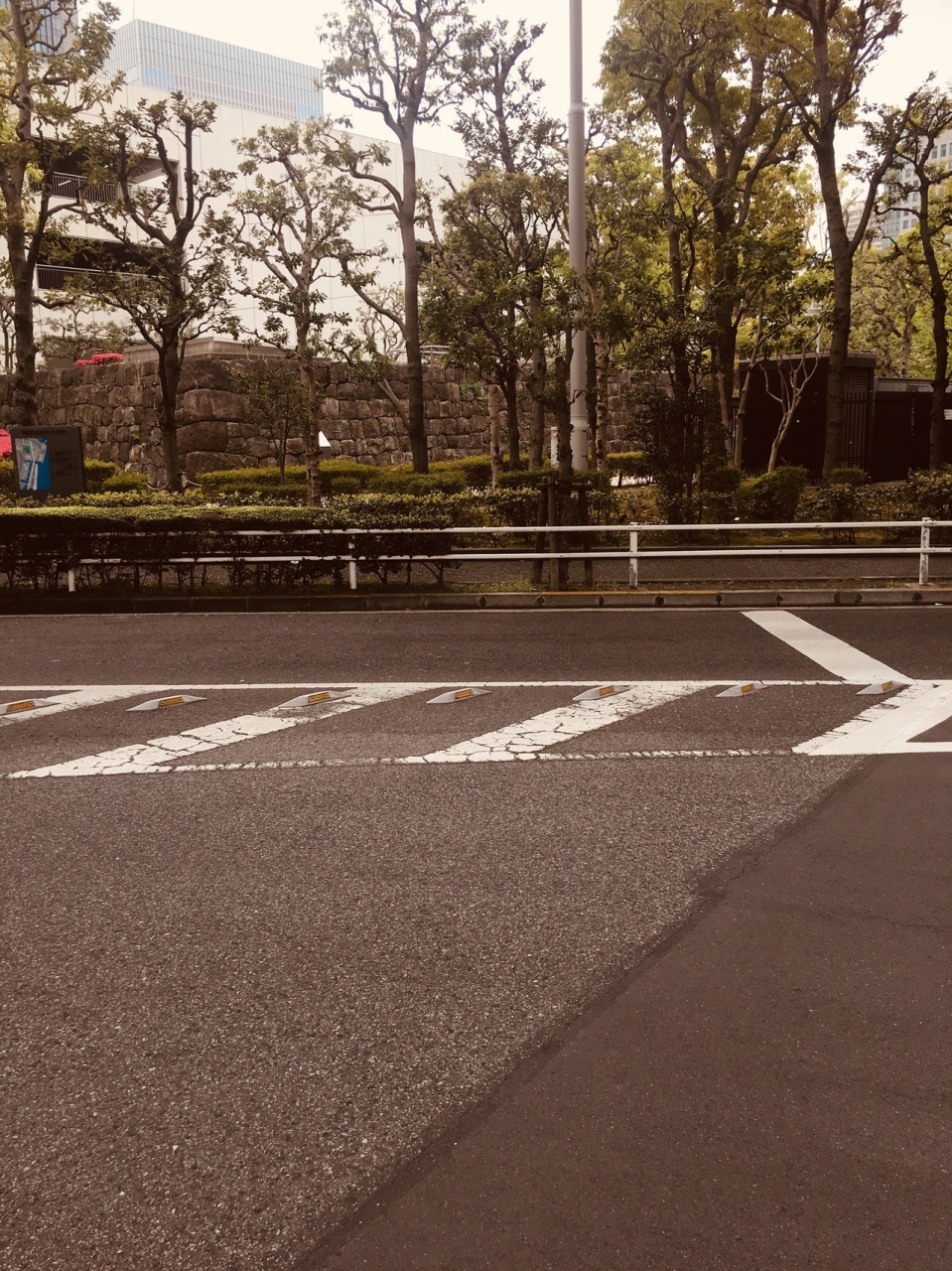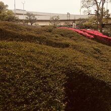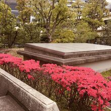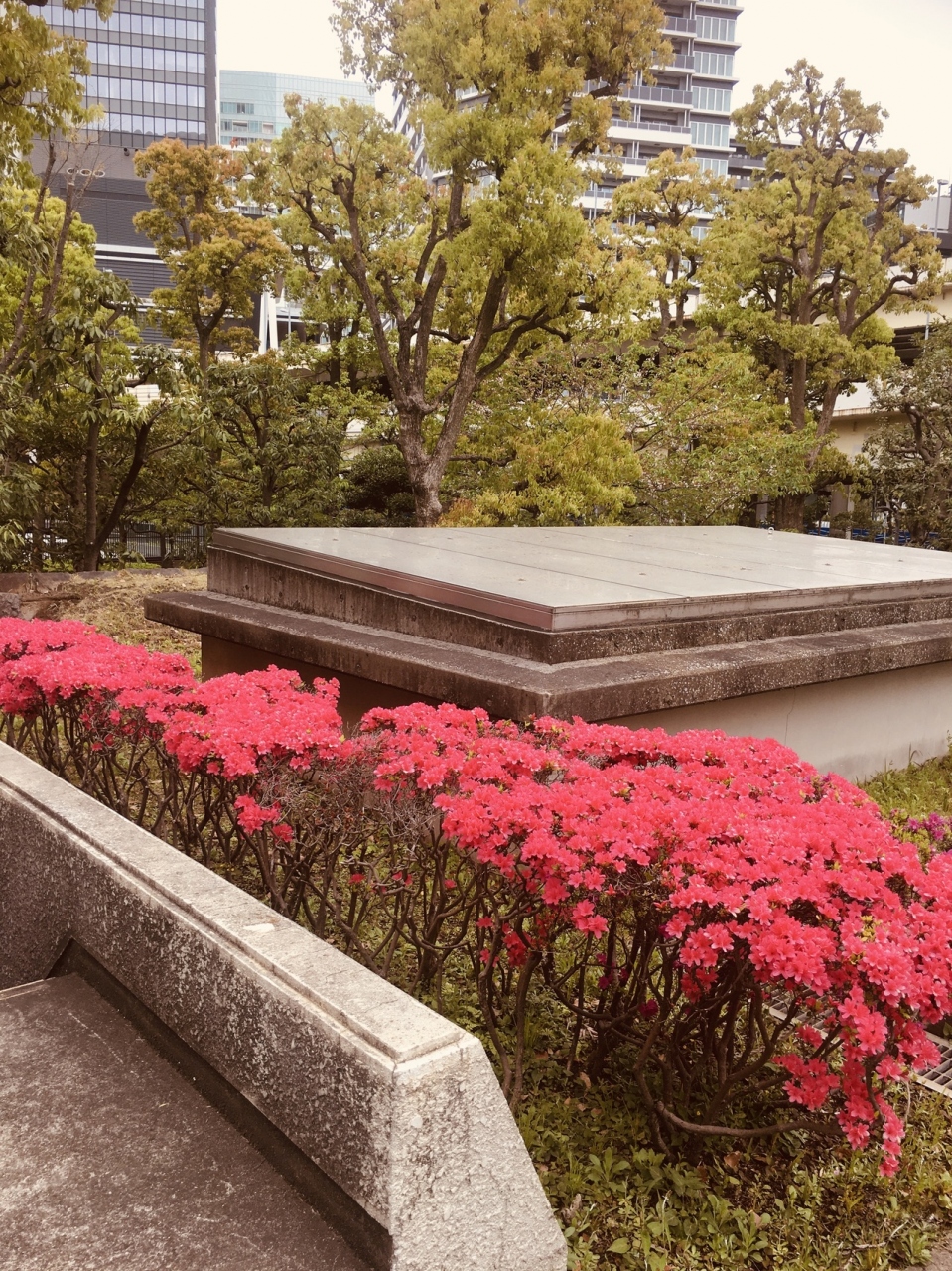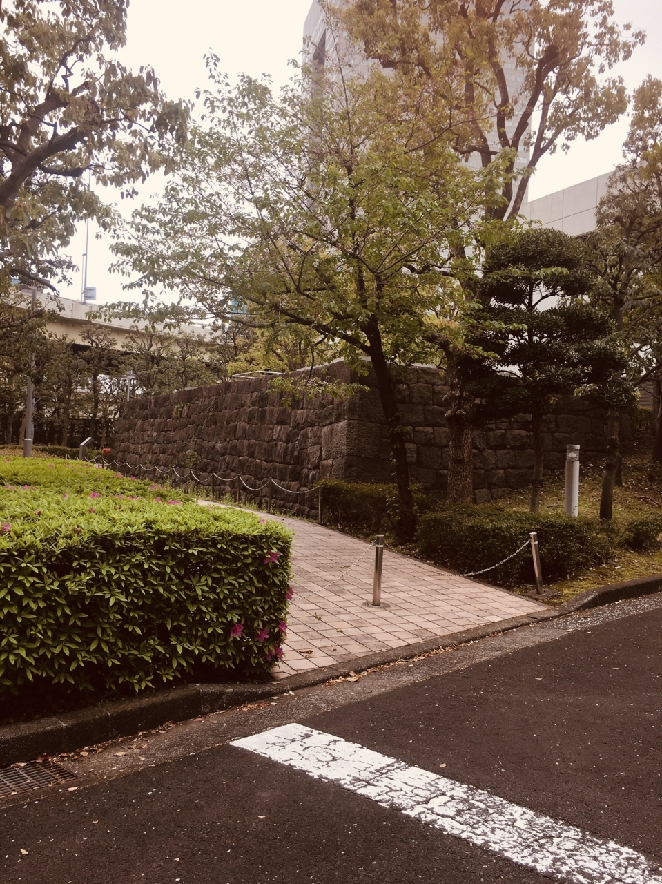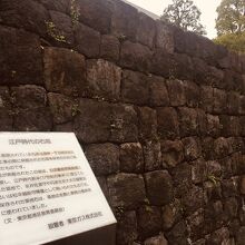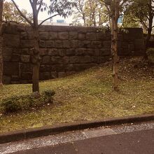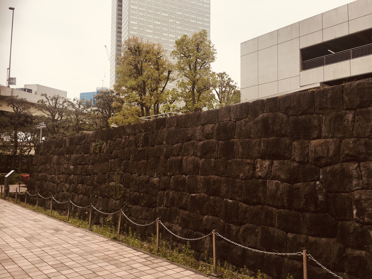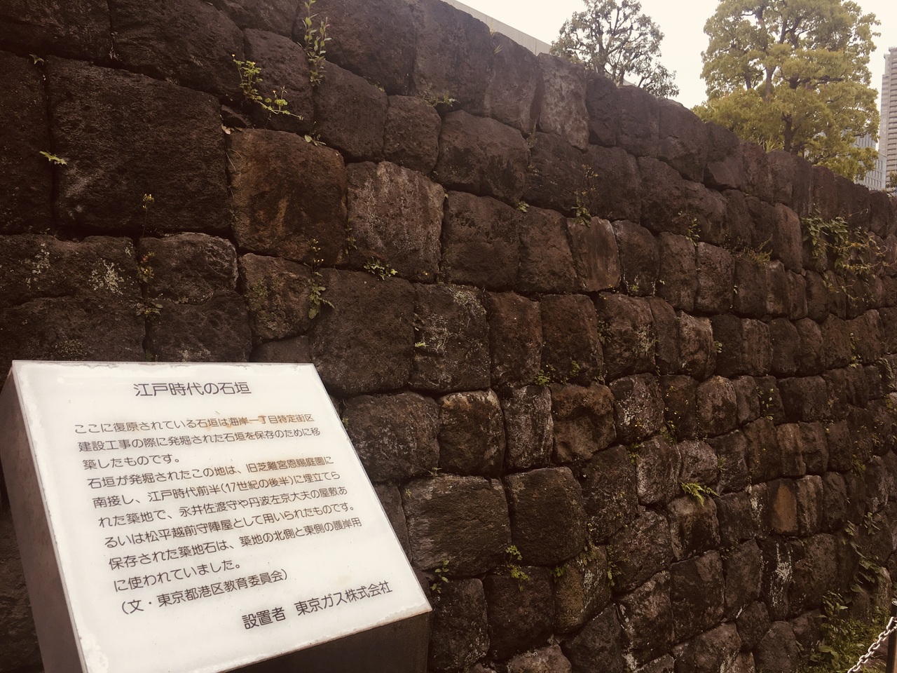 東京ガス本社ビルの敷地内にあります。大きな石垣で、後方から石垣の上に階段で上がることが出来、綺麗に花が咲いていました。石垣の上には何か建物内がのっかっていたような雰囲気がありました。石の隙間に草が生えていました。