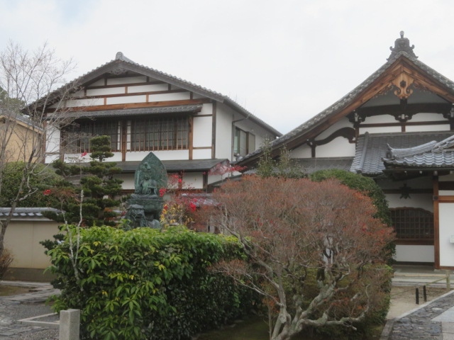 天竜寺の塔頭ということで、山門の横の石碑がかなり達筆で、さすが天竜寺です。山門をくぐると、まっすぐな参道が本堂まで続いていて、両側の庭園は奇麗に手入れされていて、気持ちのいい空間です。境内に青銅の観音様がおられて威厳がありました。