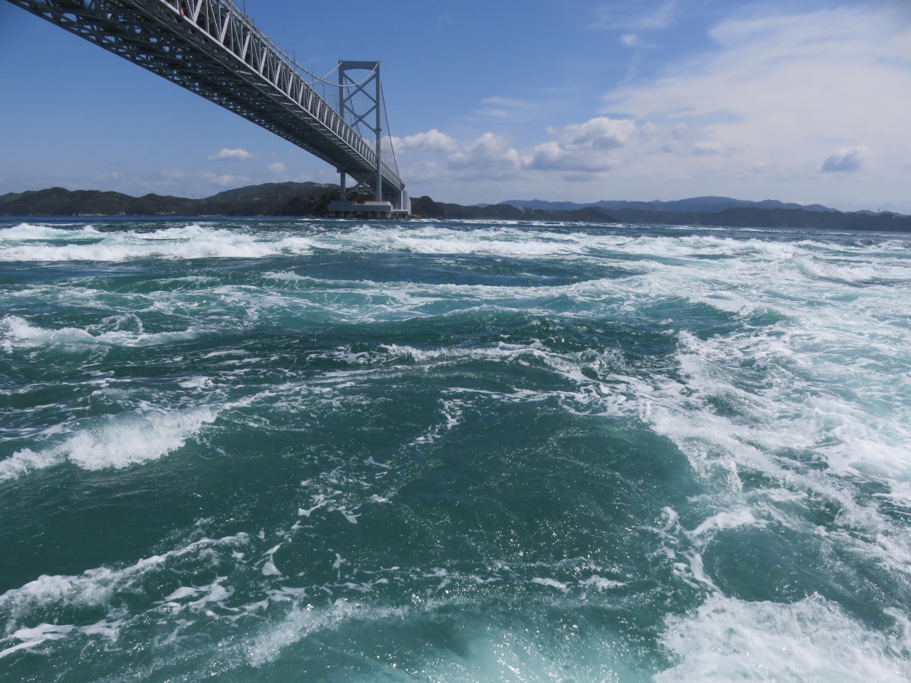 乗船料一人1600円、30分おきに船は出ていて20分ほど鳴門海峡にうず潮を見に行く感じでした。乗船口には「うずしお最前線行」となっていましたがほんとに渦潮最前線。ちゃんとバーにつかまっていないと転んでしまいそうでした。船は左右どちらの重客にも渦潮がみれるように舵を切ってくれます。近すぎてなんとなくしか渦潮はわからなかったのですが本当に迫力があってよかったです。渦潮が出来る時間は限られているようなので時間を確認して行きましょう。
