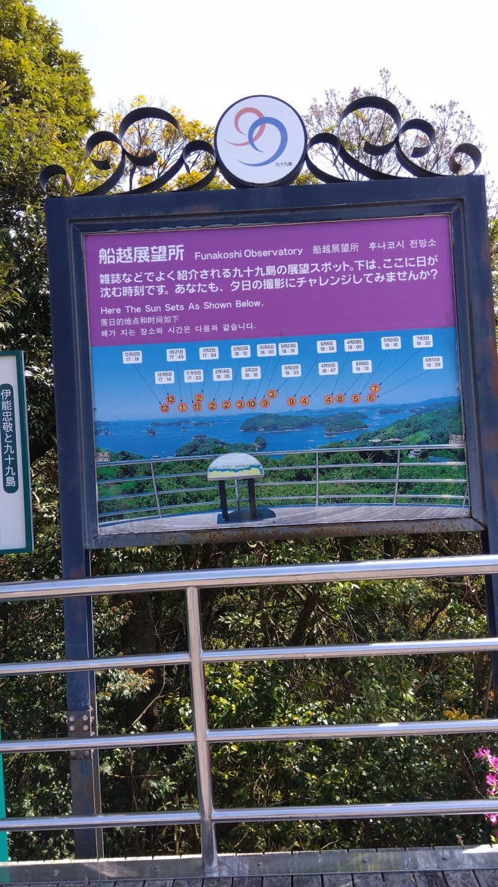平日の午後に行きました。観光客は少なめです。道路沿いにある小さな展望所です。車も数台しか停められません。季節によって夕陽の沈むポイントが書いてある案内板がありました。島々が美しい海が広がって大変景色の素晴らしい場所です。