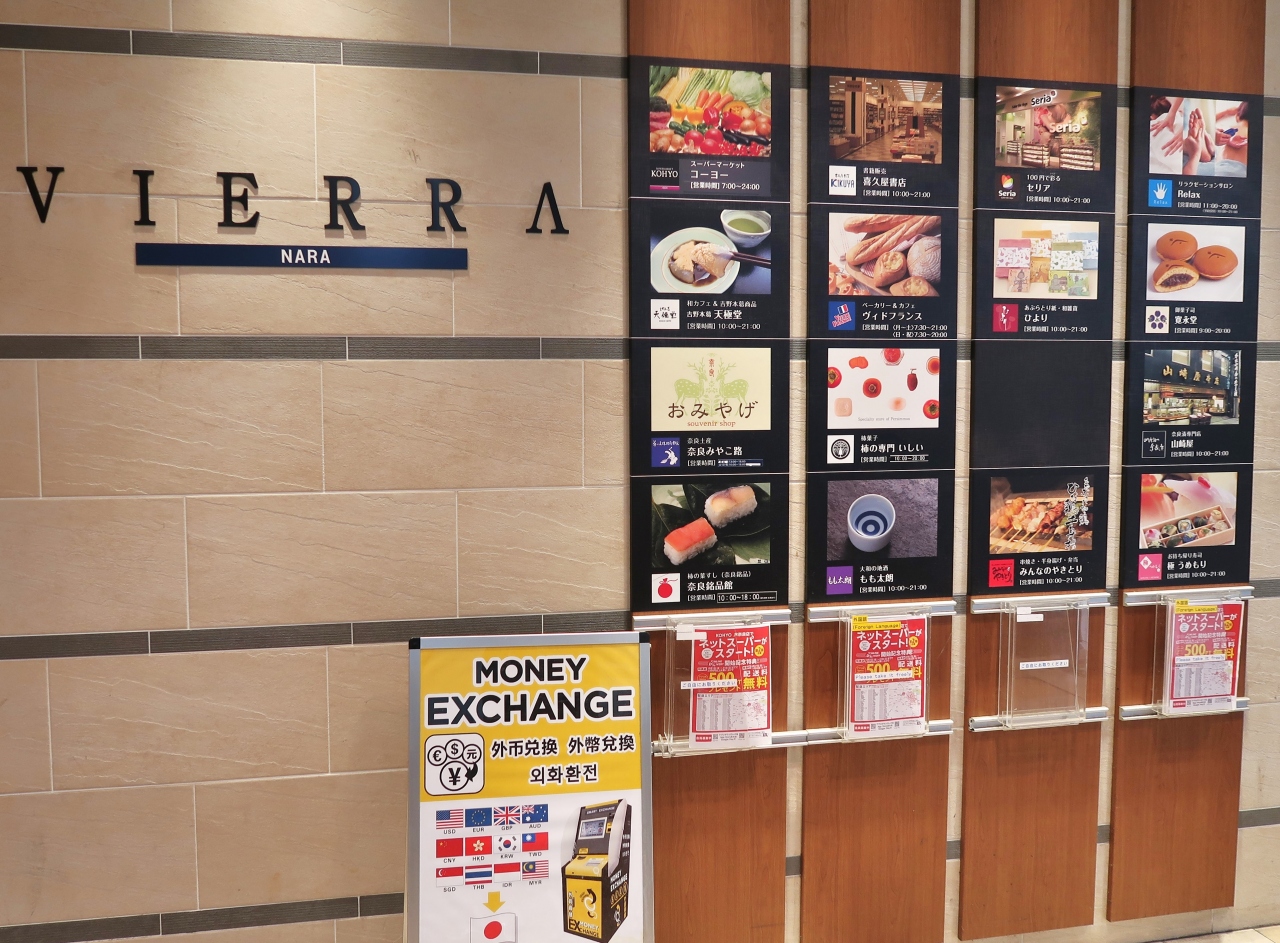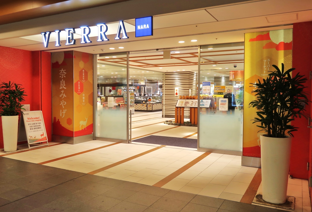JR奈良駅に直結の観光客にも便利なショッピングモールです。1階にはスーパーマーケット、2階には、奈良のお土産がいろいろ揃っていました。100円ショップのセリアや書店もあり、奈良に関する書籍も購入できます。セリアと書店の奥には、10時から21時まで使える郵便局のATMもありました。