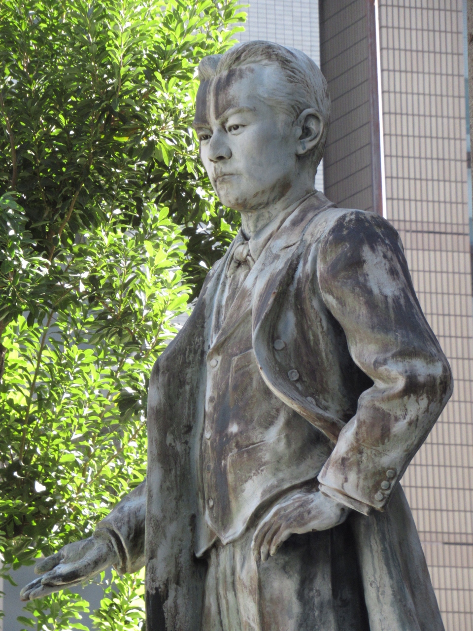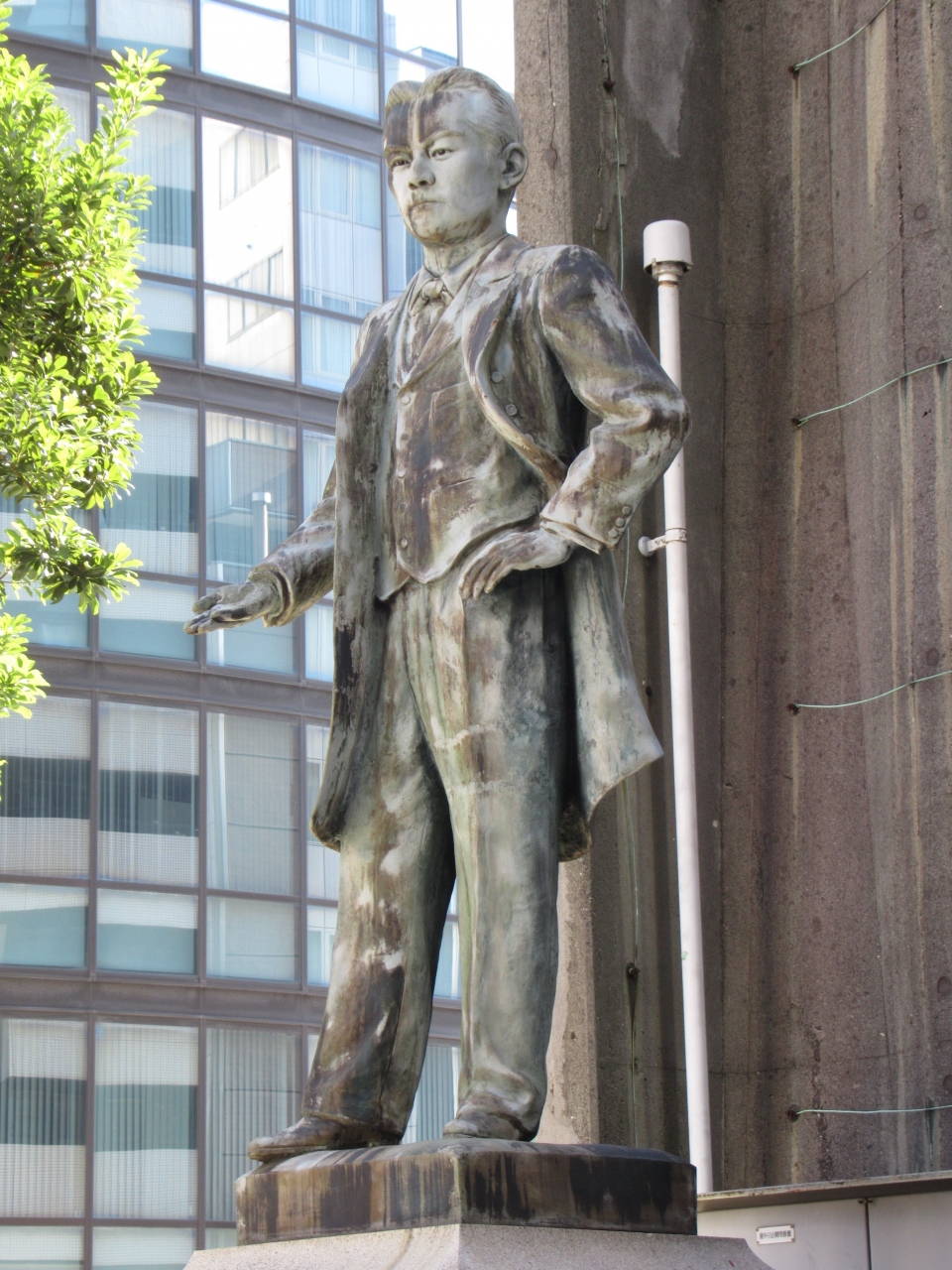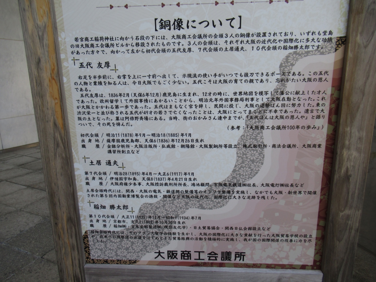 大阪市中央区にある大阪商工会議所ビルの前の若宮商工稲荷神社に向かう石段の下には、大阪商工会議所の会頭3人の銅像が設置されていて、その一つが初代会頭の五代友厚像です。