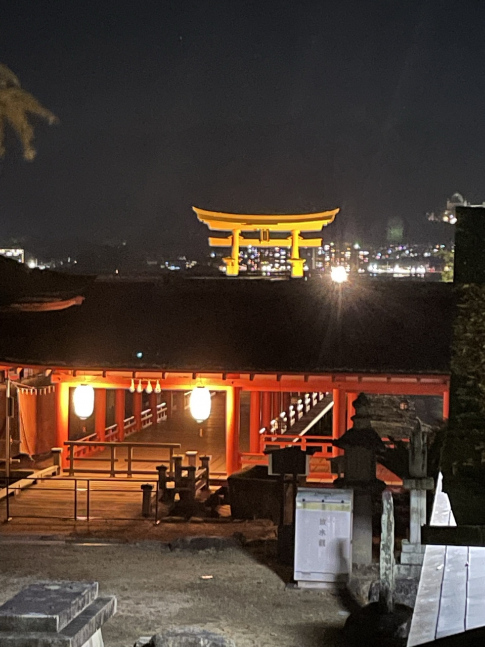 昨年11月に改修が終了した厳島神社の大鳥居のライトアップは有名ですが、厳島神社境内全体もライトアップされていました。境内には夜間は入ることができませんが、外からも幻想的な雰囲気を楽しむことができました。