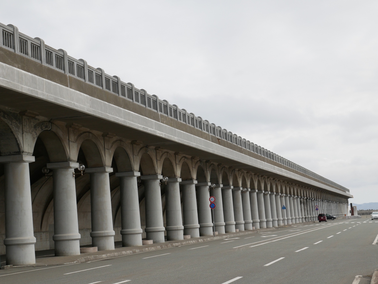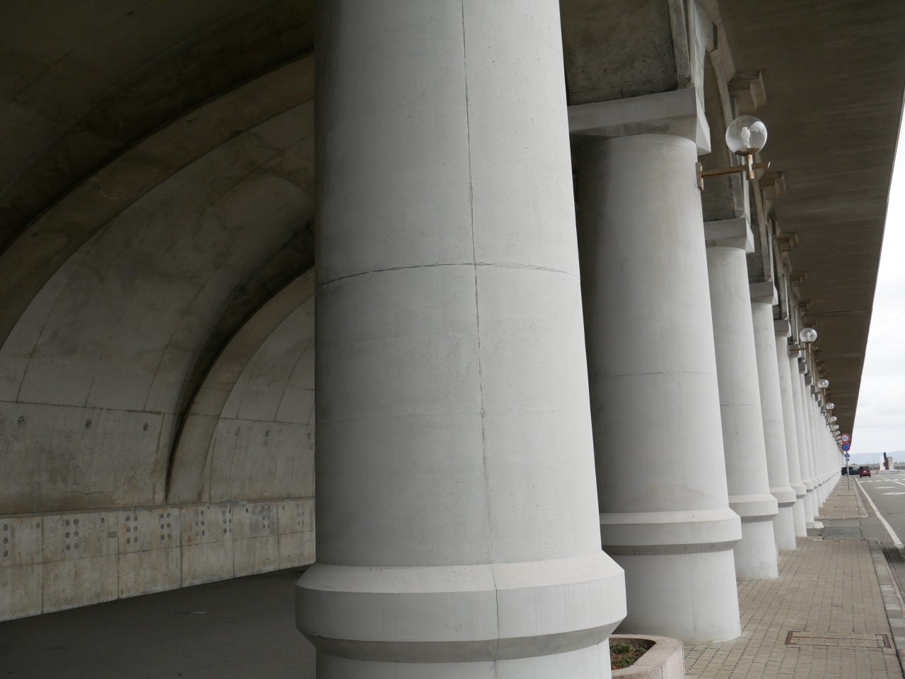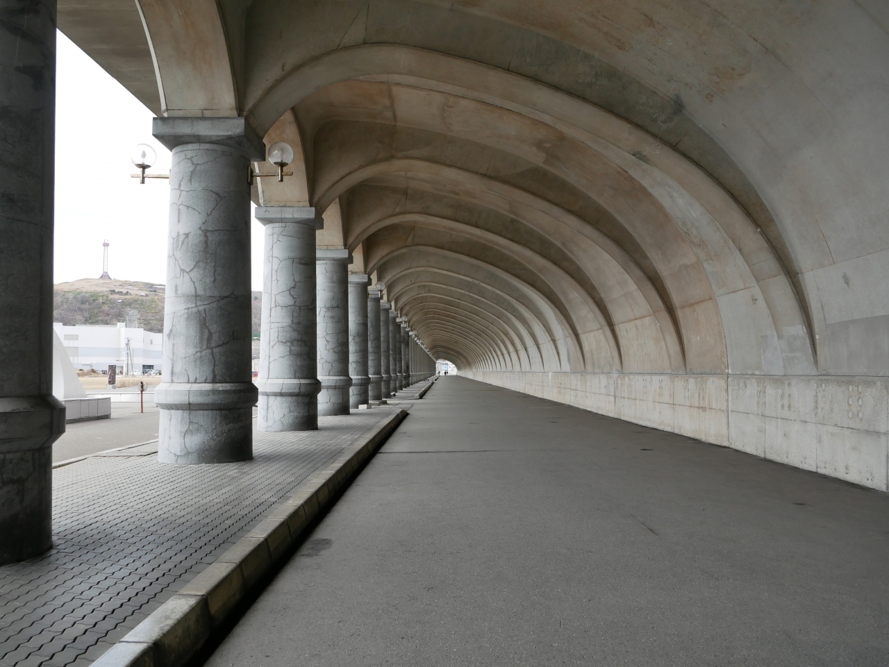 単なる防波堤じゃなく、樺太行きの連絡船もここから出ていたので、乗客などに波がかからないように天井を付けてドーム状の桟橋になったとのことです。