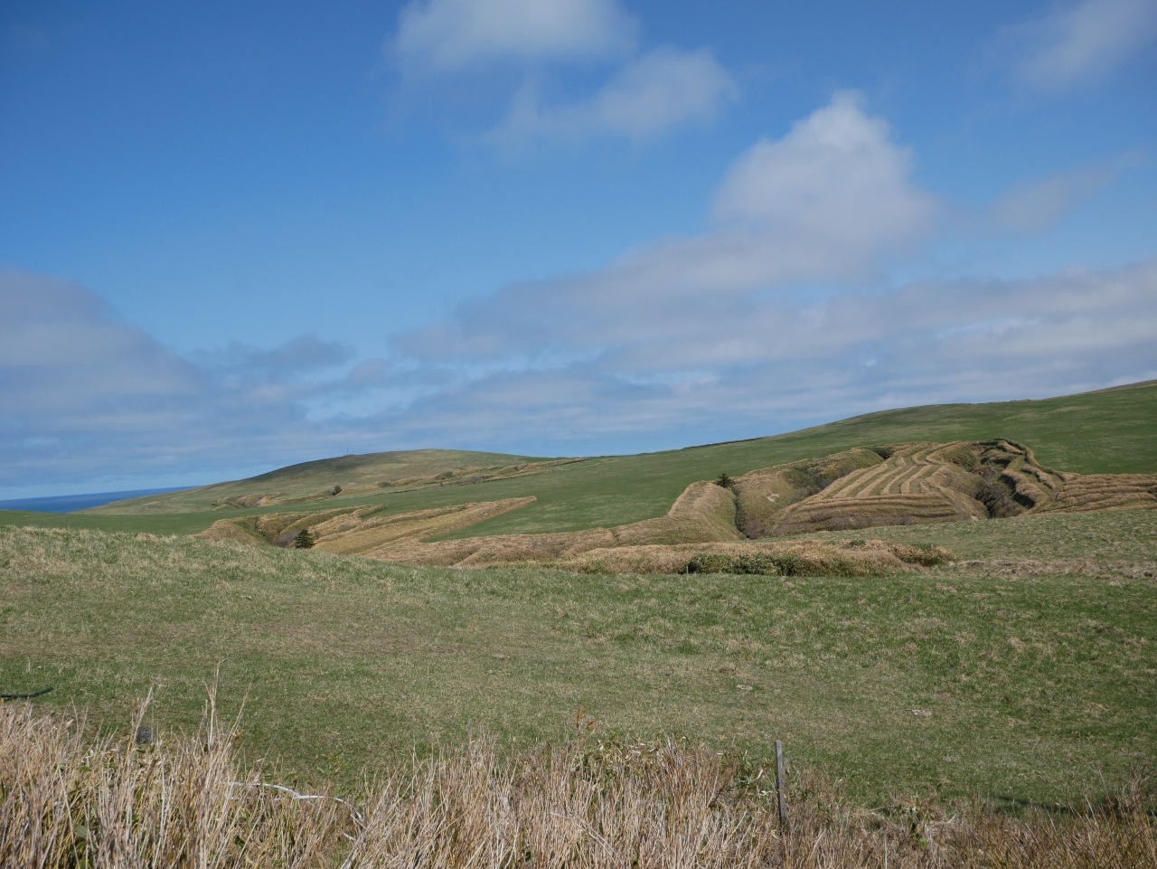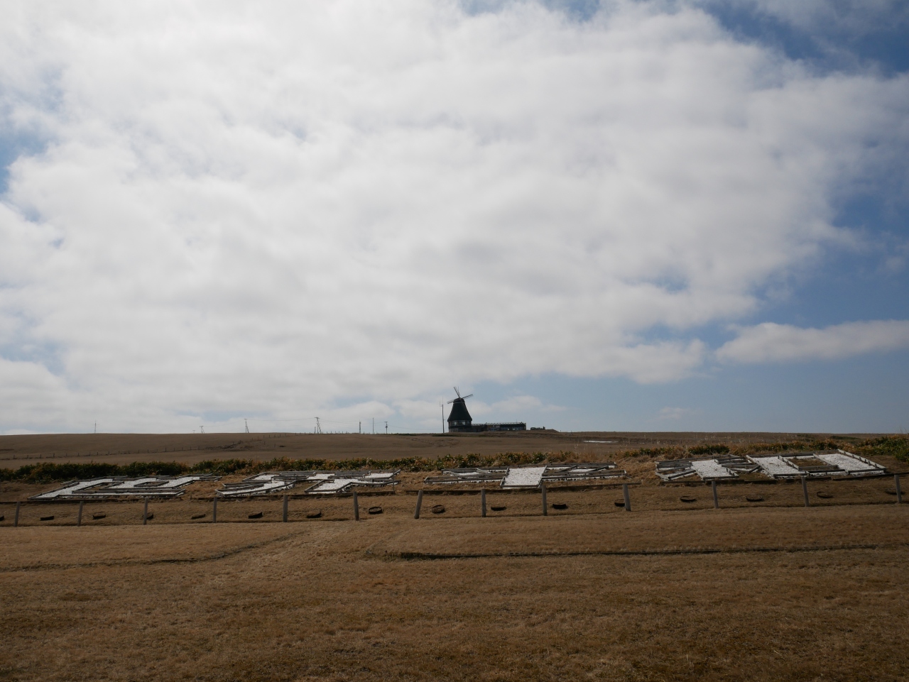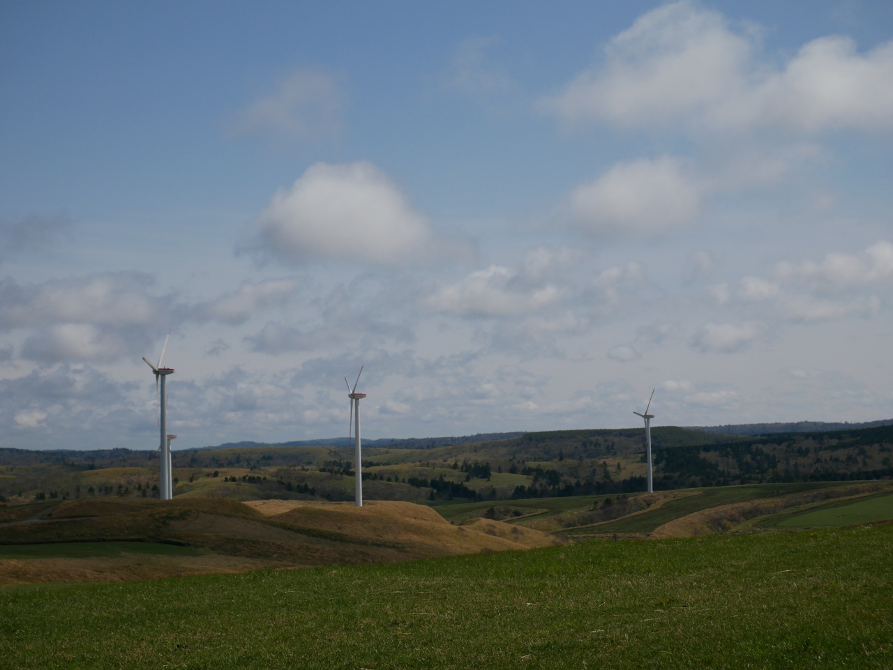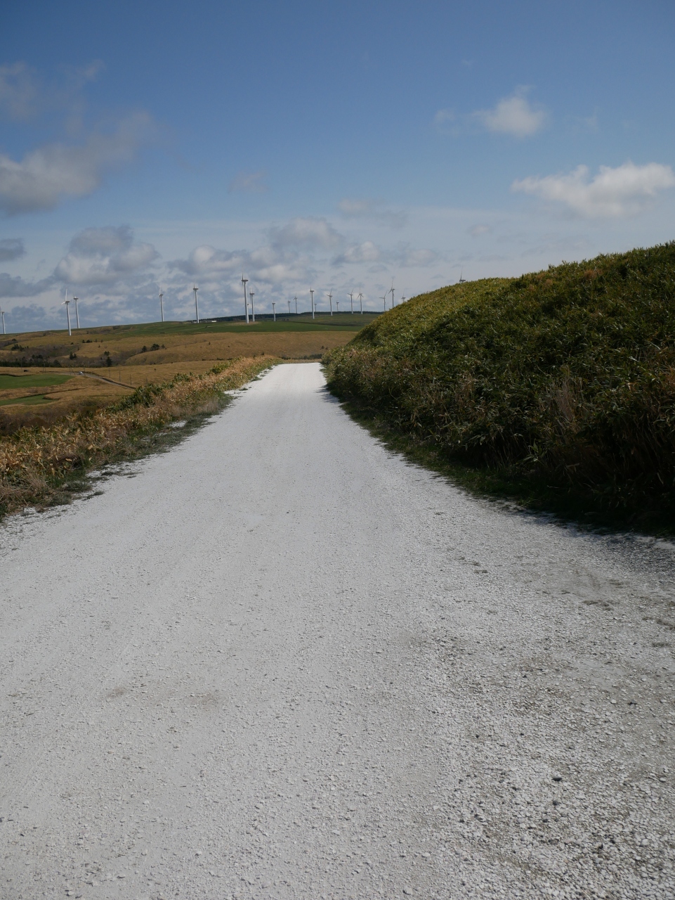 宗谷岬から宗谷岬公園の丘に登り、白い道へ向かっていくと、道路の両側にまさに絶景、広いなだらかな丘陵、牧草地、そして、たくさんの風車がアクセントになっています。