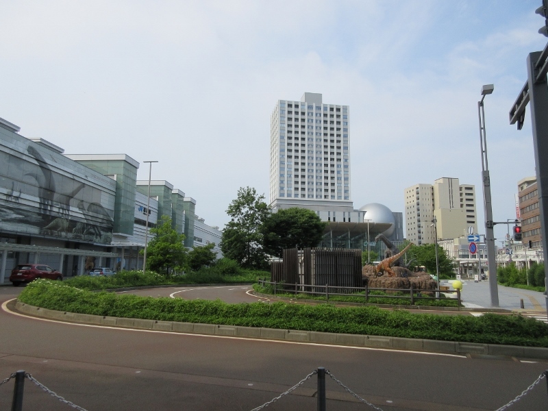 福井では駅のベンチにも恐竜がいますが、福井駅の恐竜広場は駅のロータリーに3体いました。駅の壁にも恐竜が描かれていて、驚きました。今回は恐竜博物館には行きませんでしたが、次に福井に来たら行きたいと思いました。