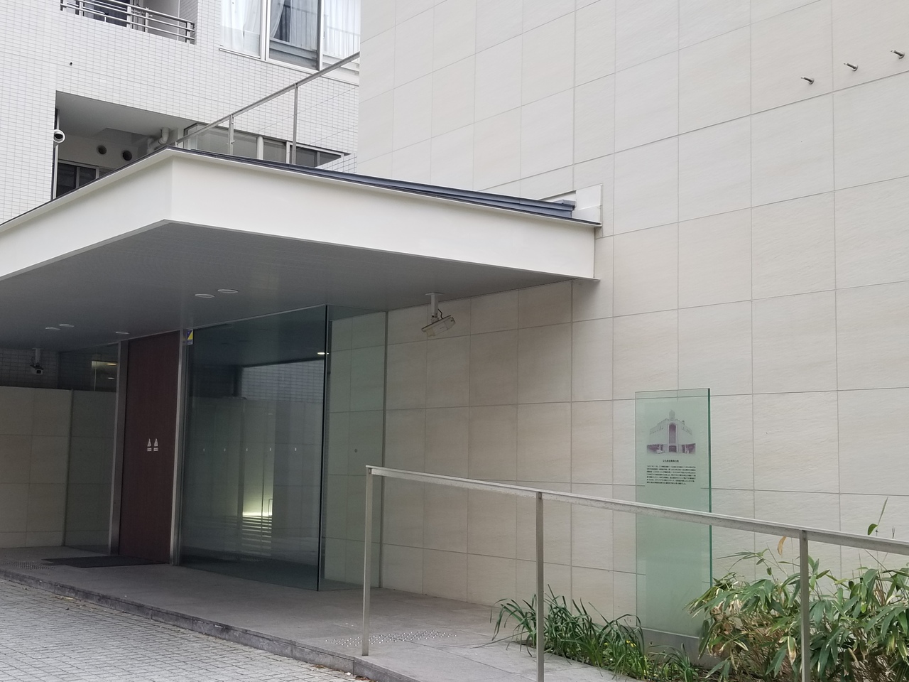 坂道をのぼるとLANTENNE YOTSUYAというマンションがあり、玄関先ににガラスでできた記念碑がある。