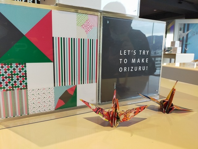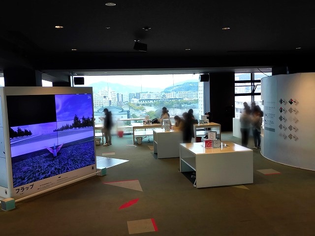 映像を使った体験コンテンツが3つあって、画面に自分を認識させると、画面の折り鶴と自分が連動されて、手をバタバタさせると画面の折り鶴が羽ばたいて、広島市街を飛んでいくゲームがあったり、100円で折り紙を購入し、折り鶴を折ってタワーの投入口へ。平和の祈りをこめた折り鶴がいっぱいになっていくようです。