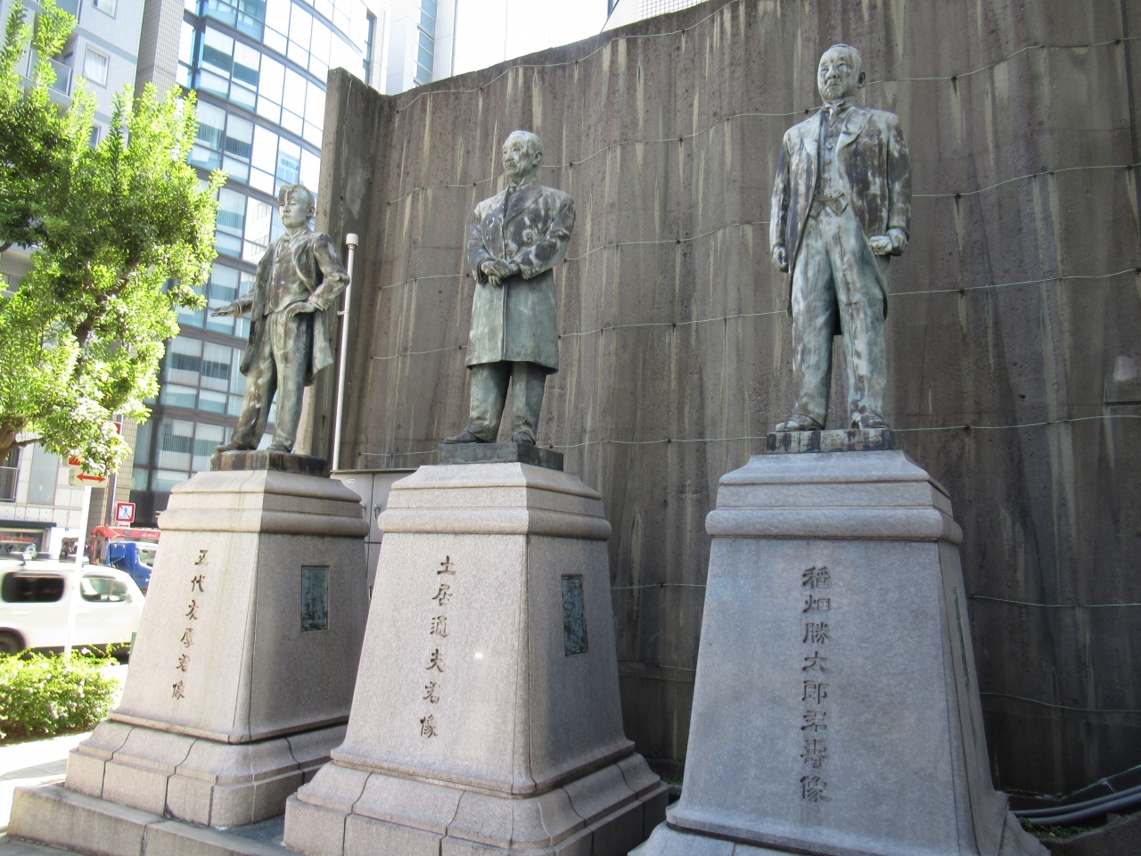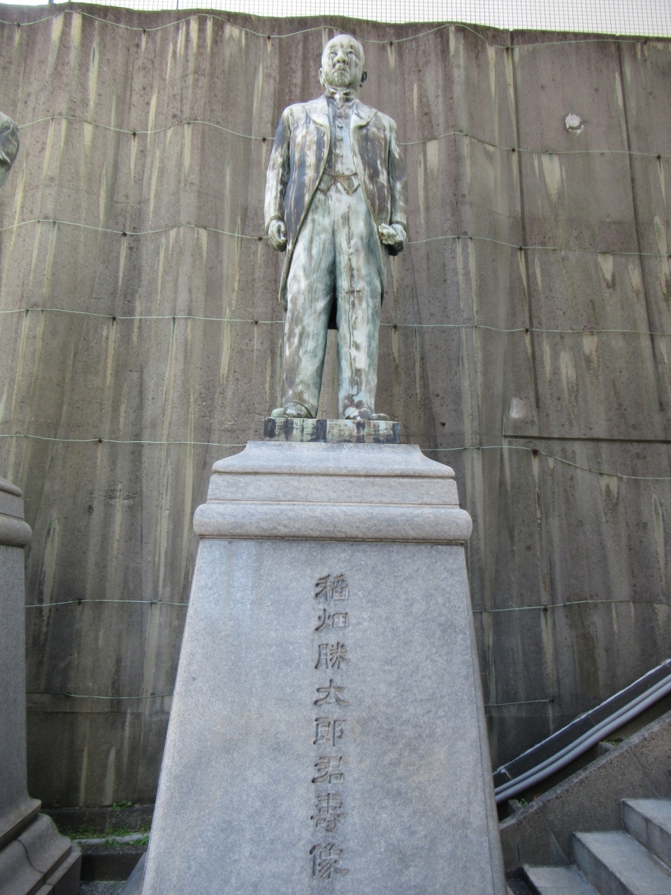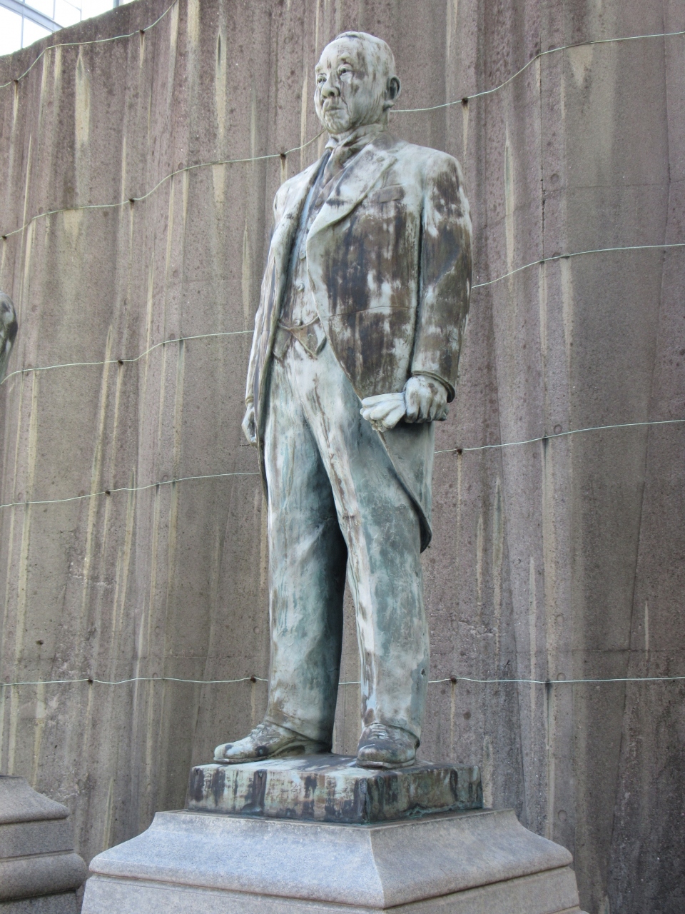 大阪市中央区にある大阪商工会議所ビルの前の若宮商工稲荷神社に向かう石段の下には、大阪商工会議所の会頭3人の銅像が設置されていて、その一つが10代会頭の稲畑勝太郎像です。