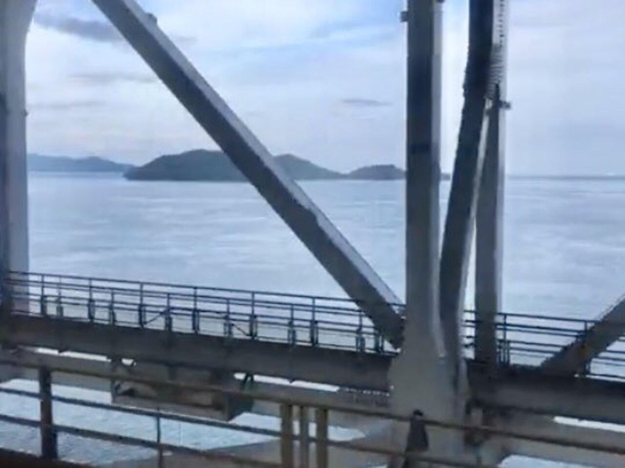 定期寝台特急サンライズ瀬戸に乗車して、朝の7:00少し前に瀬戸大橋を渡りました。車窓は橋の鉄骨の合間に景色といった感じで、上にある自動車道の車からのほうが景色が良いと思います。本当は2階席だったら、もう少し長めの良い景色を見れたのかもしれません。