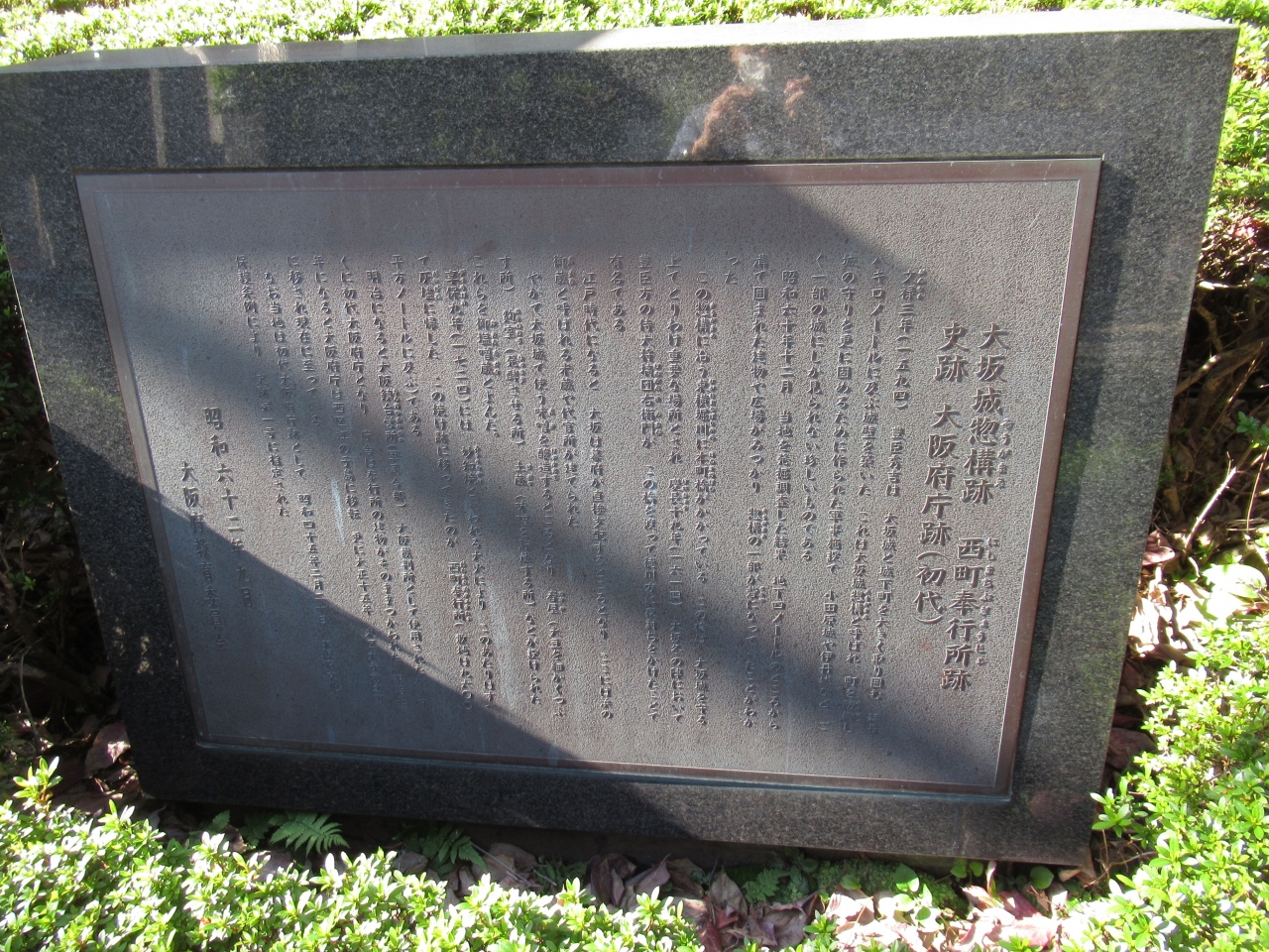 西町奉行所跡は、大阪市中央区本町通2丁目、大阪商工会議所の北側に隣接しているマイドームおおさかの前にあります。