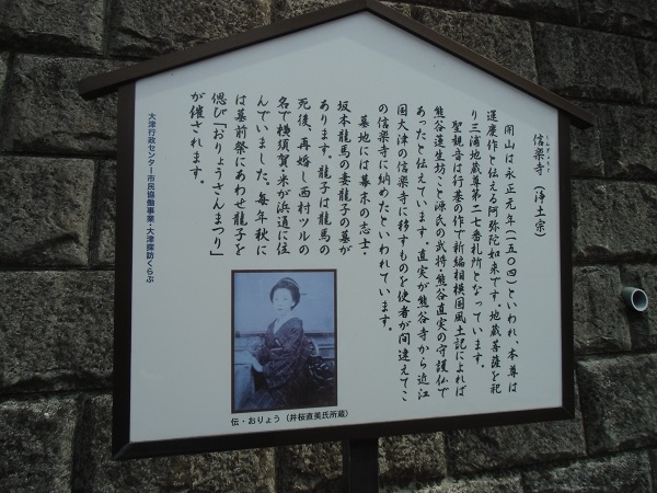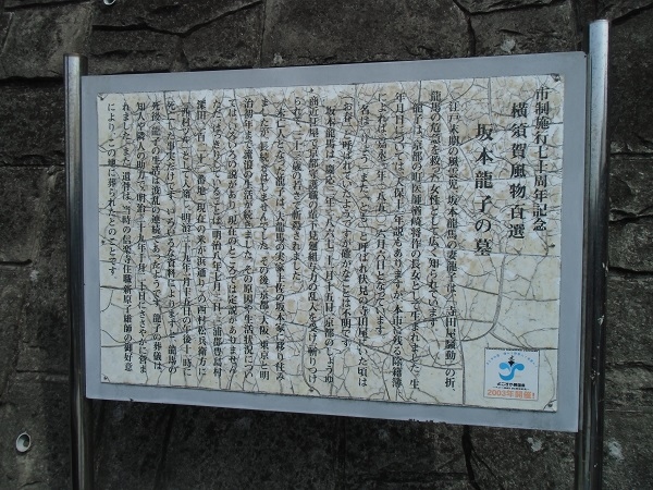 説明板によると、龍馬が近江屋で斬殺された後、おりょうは各地を転々とし、最後に現在の横須賀にいた西村松兵衛方に「西村ツル」として入籍し、明治39年に死亡しました。