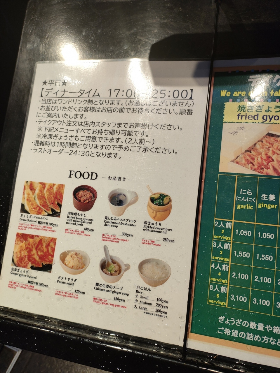餃子の種類は2つのみ。定番のニラにんにくと生姜餃子があります。京都が発祥で舞妓さんでも食べられるようにと一口サイズにしているようです。8個で500円は高いかなと感じました。