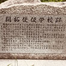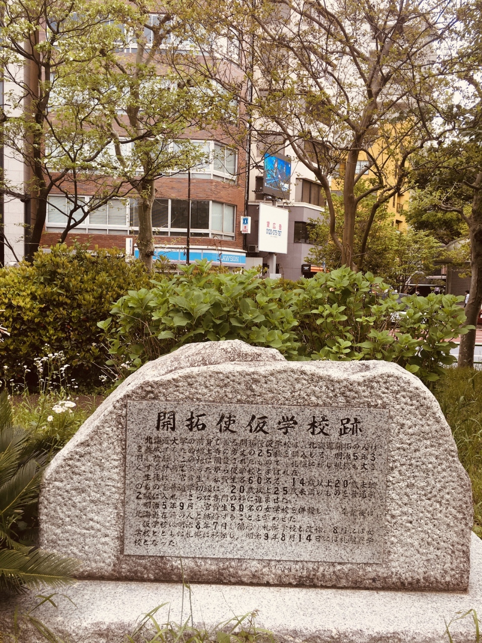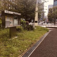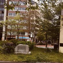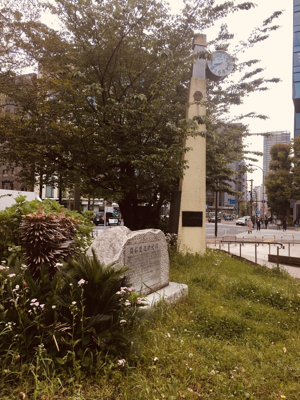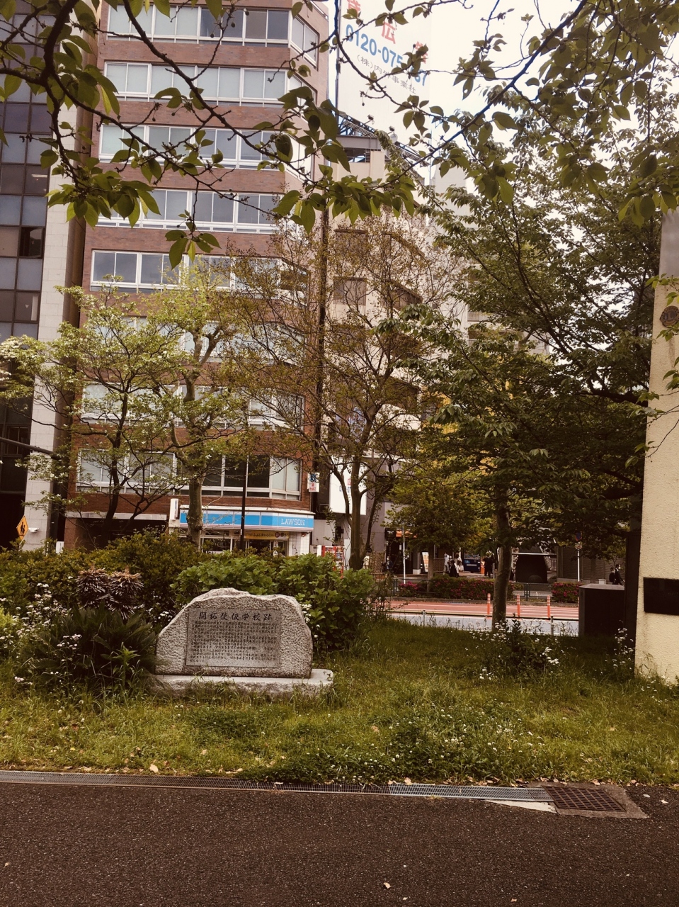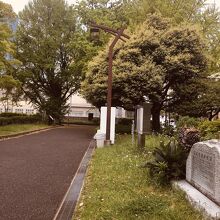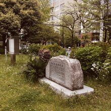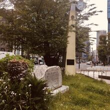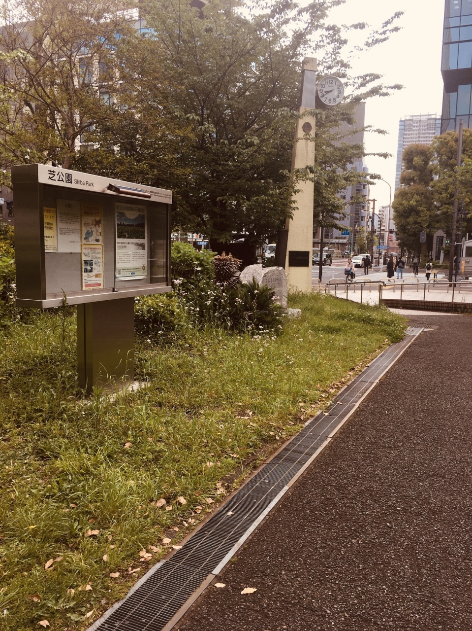 芝公園の4号地内の御成門駅の出入口の近くにあります。草木が生えた場所には、地面に置いてあるような感じの横型のおむすび型の石碑で、文字が刻まれていました。右側には塔があり、時計がぶら下がっているような光景でした。