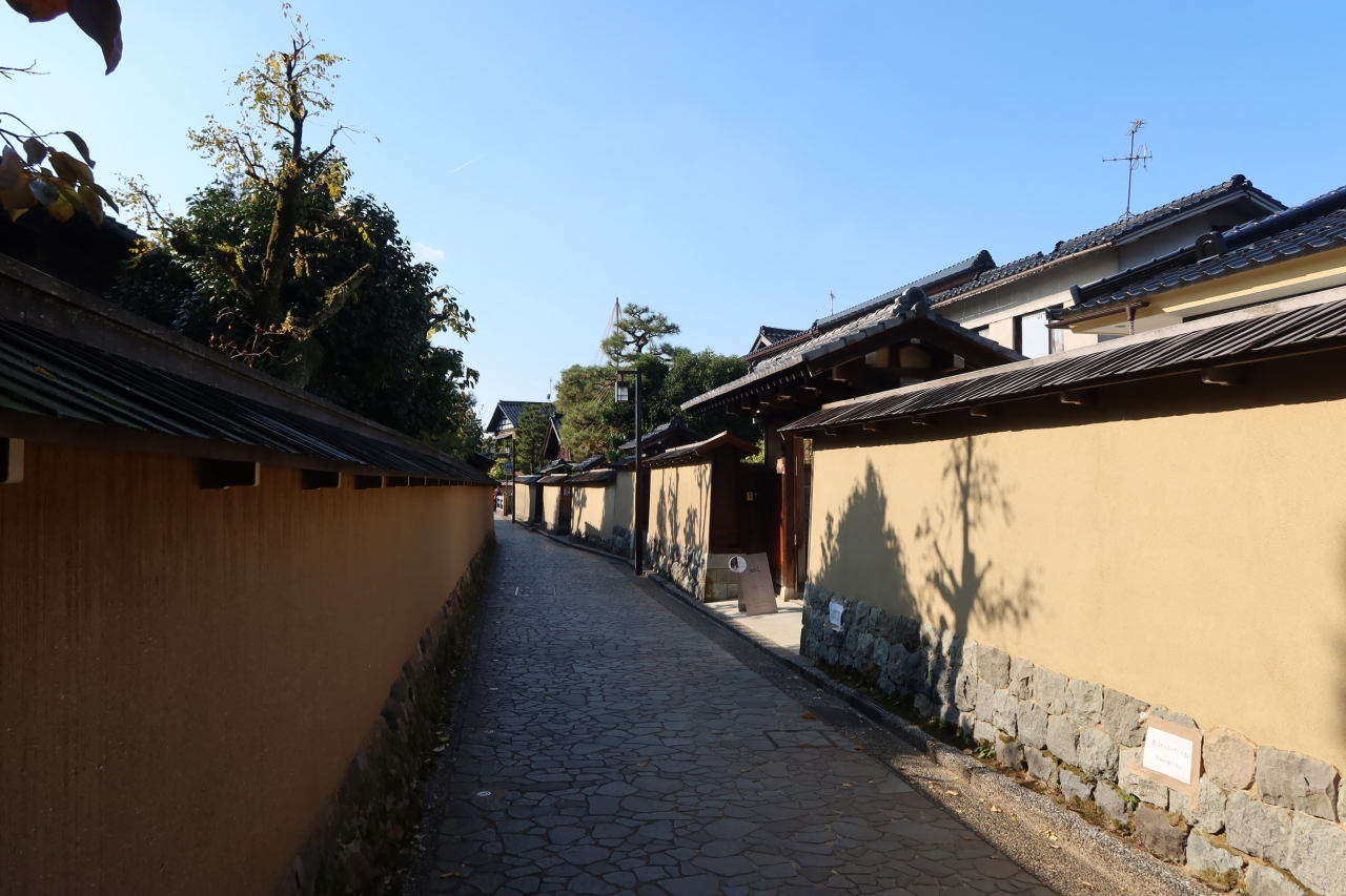 加賀藩時代に藩士の邸宅、屯所などが建ち並んでいたエリアで、武家屋敷然の建物が多く残っていました。(復元や景観に合わせてわざわざ意匠を造ったのもあると思いますが)