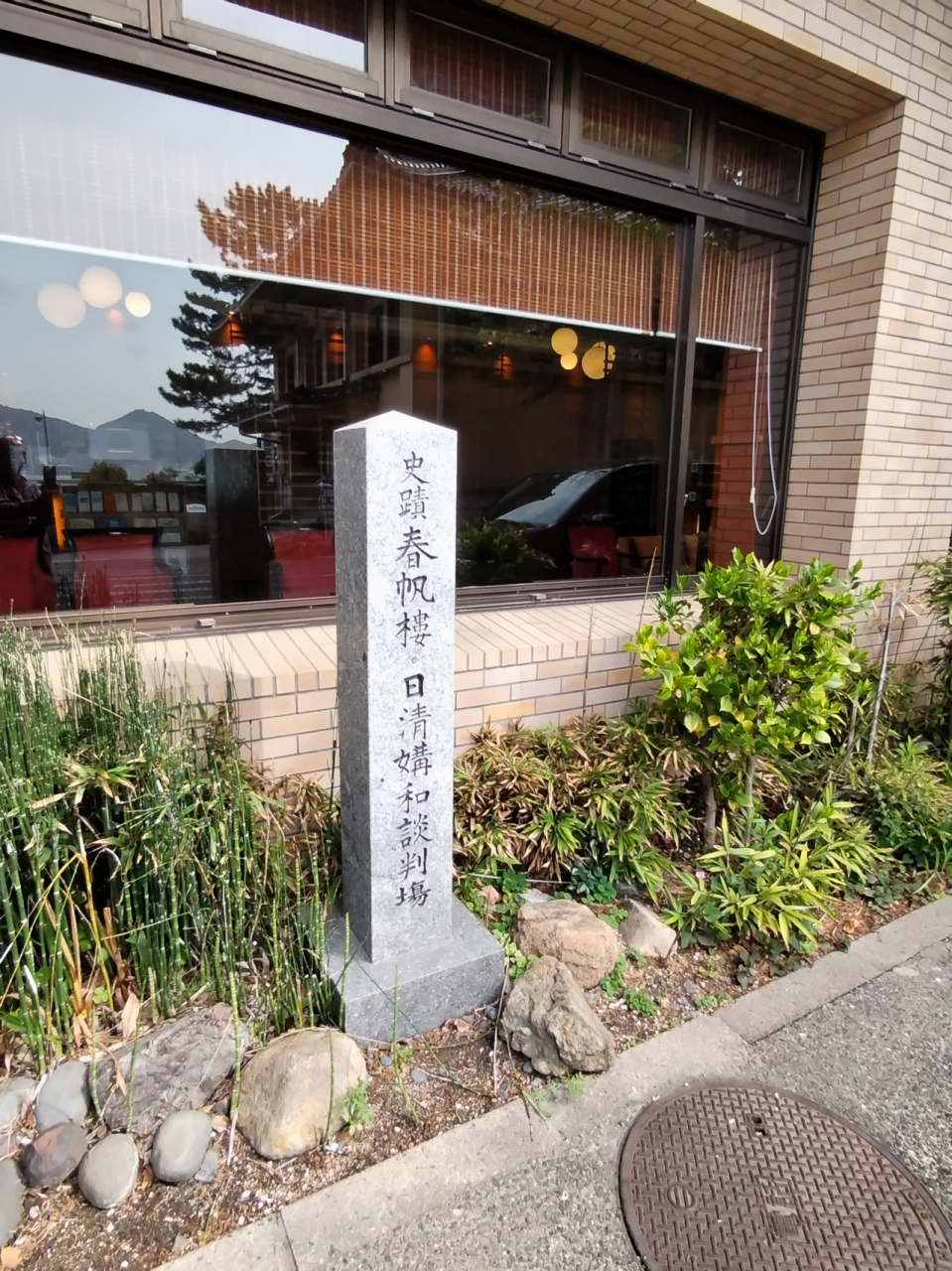 下関の駅からレンタサイクルで行きました。赤間神宮の隣にあります。春帆楼には日清講和談判場の石碑が立っています。石碑の前に伊藤博文と陸奥宗光の胸像と日清講和記念館(無料)があり、歴史にふれることができます。