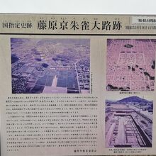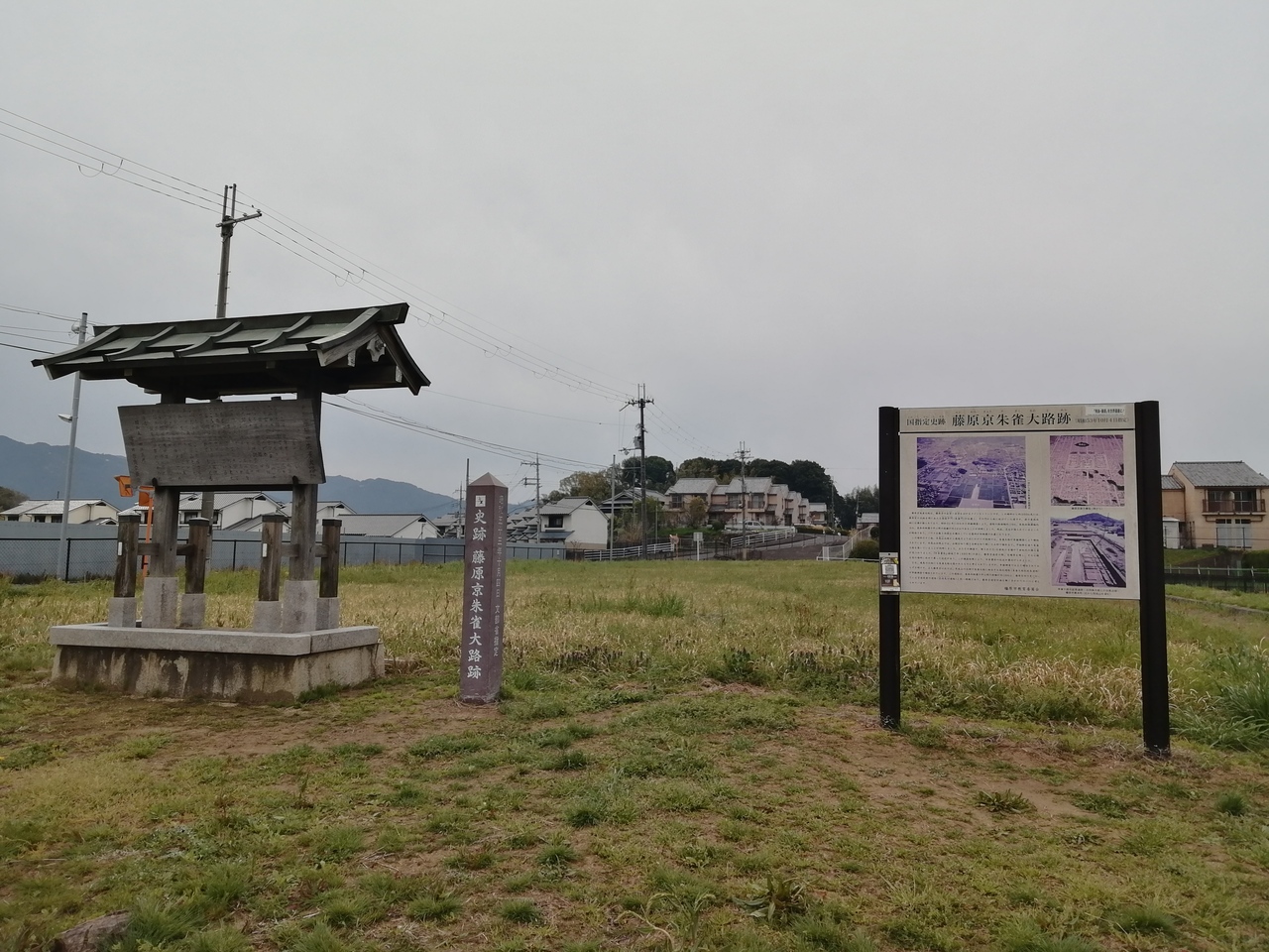 694年(持統8年)から710年(和銅3)にかけて栄えた藤原京。その南正門から南に延びる朱雀大路跡です。発掘調査によると道路幅が19m、両側にある側溝の幅が各4mとのこと。現在は田んぼや住宅地になっていてその一画に案内板が建てられています。藤原宮を見学する際はこの案内板から“朱雀大路跡”を通って行くと雰囲気が出ると思います。