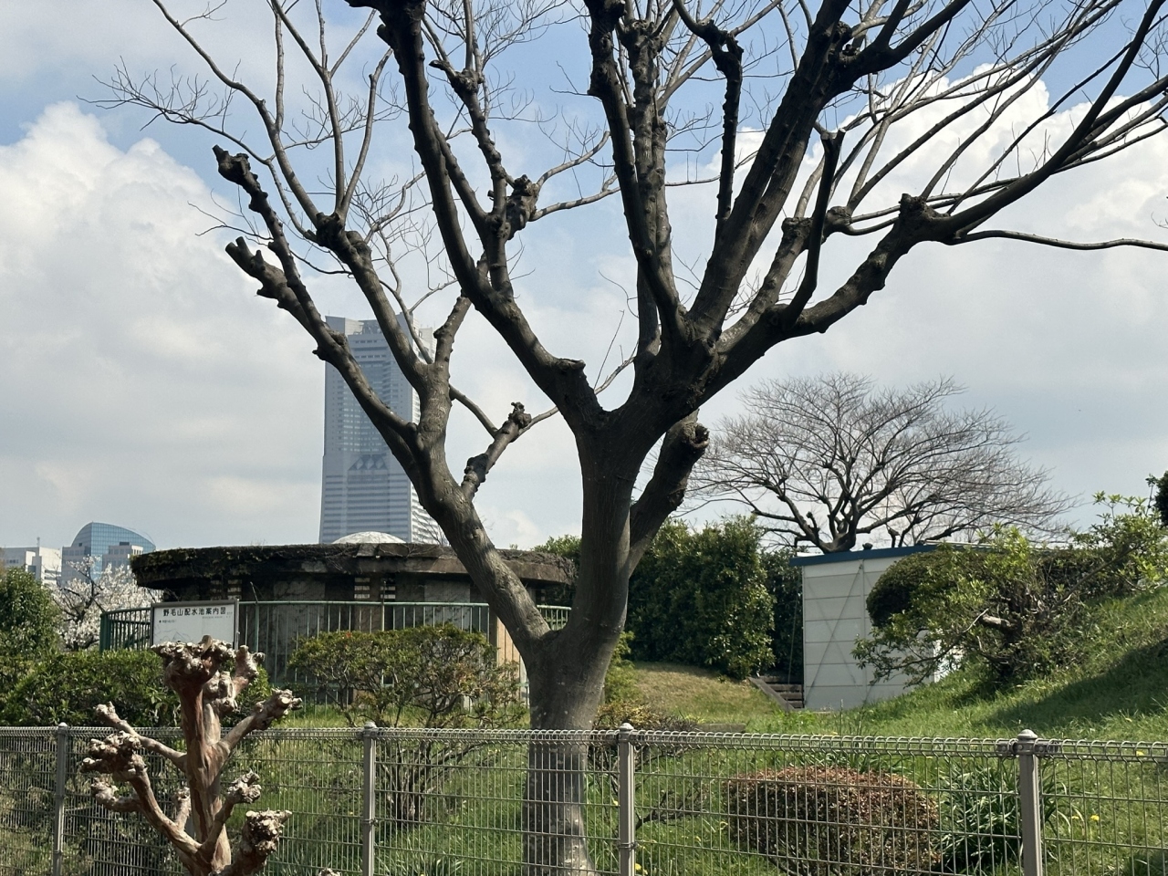 野毛山公園の展望台近く、野毛山動物園から野毛のつり橋を渡ってすぐのところに、円柱型の施設(流入弁室)の跡があります。以前はこの上にドームが乗っていましたが、今はなくなっています。通りに面して、「野毛山配水池」と書かれたこの施設跡の入口がありますが、門が閉ざされていて、中には入れないようになっていました。