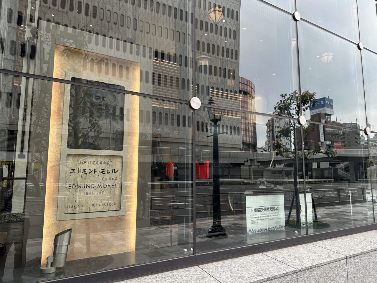 JR桜木町駅の西口を出てすぐのところ、CIALの1階に「旧横濱鉄道歴史展示」のコーナーがあり、その一画にエドモント・モレルのレリーフがあります。レリーフは屋内にありますが、外からガラス越しに見られるように置かれています(屋内からは見えない角度にあります)。エドモント・モレルはイギリス人の鉄道技師で、明治3年に日本に招かれ、日本の鉄道建築の指揮を執った人物です。