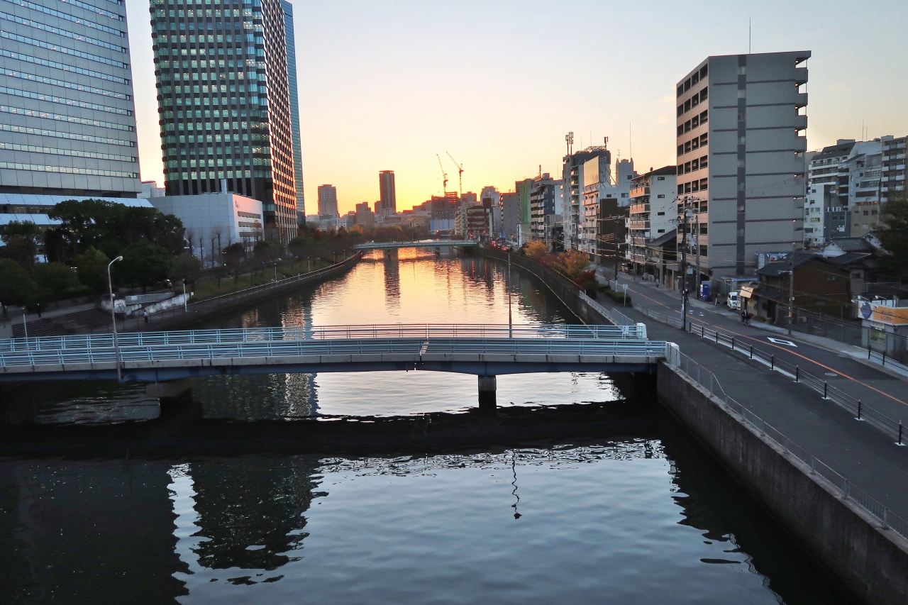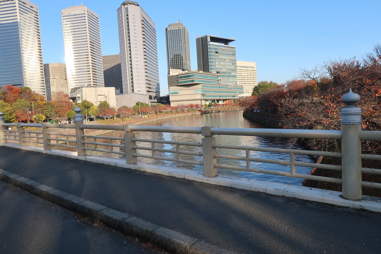 大阪城から京橋駅方面へ向かう際、目にする川です。大阪城京橋プロムナードの上から、夕暮れ色に染まる寝屋川を眺めました。大阪城ホール近くには、第二寝屋川が流れていました。第二寝屋川沿いに植えられた木々がちょうど紅葉していたこともあり、こちらの川の眺めの方が美しく感じました。