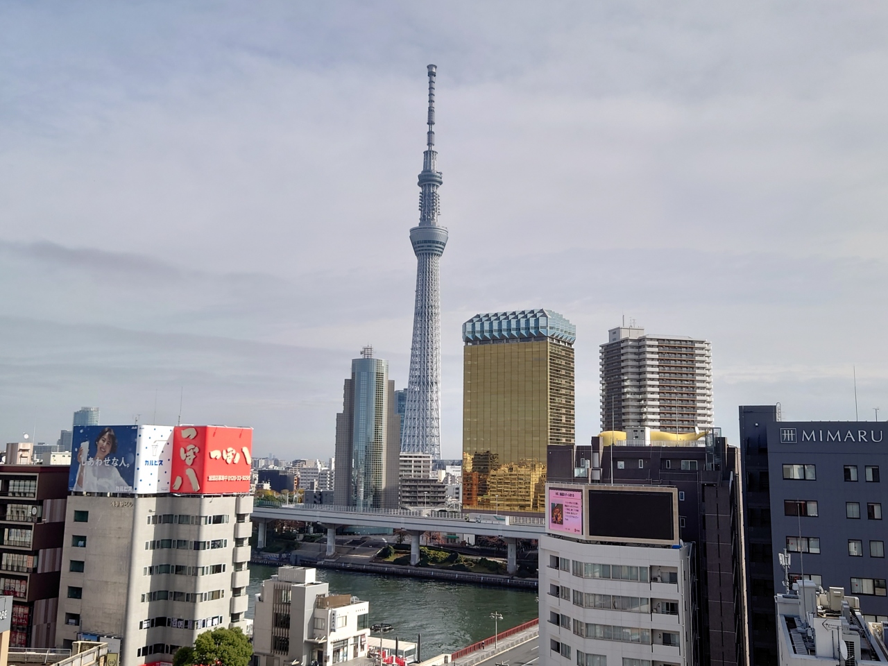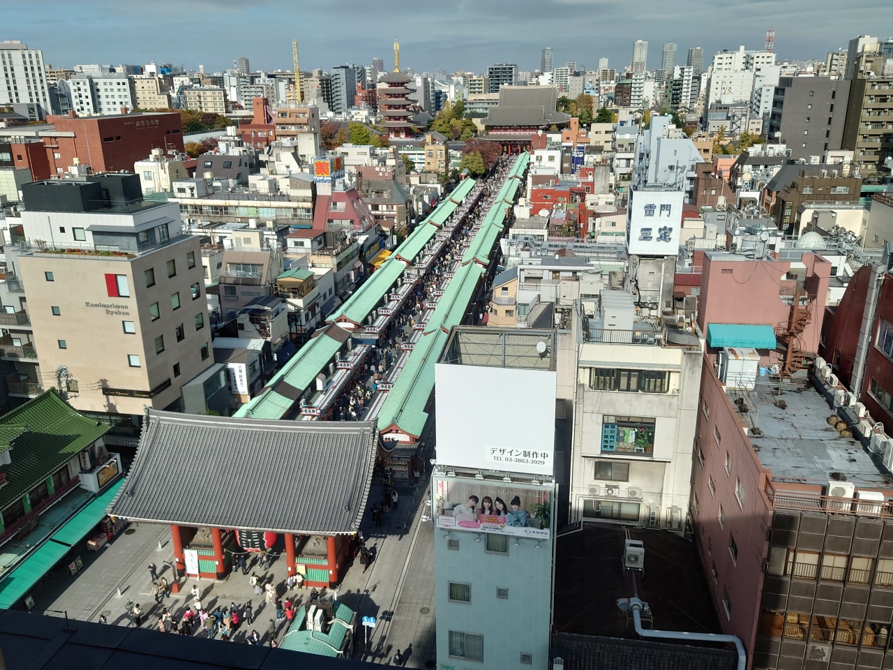 浅草寺雷門の目の前、道路を挟んで反対側にあるにある浅草文化観光センター。エレベーターで8階の展望テラスに上ると浅草寺が一望できる。さらに右を見ると、スカイツリーも良く見える。台東区の施設で入場無料の展望の穴場です。