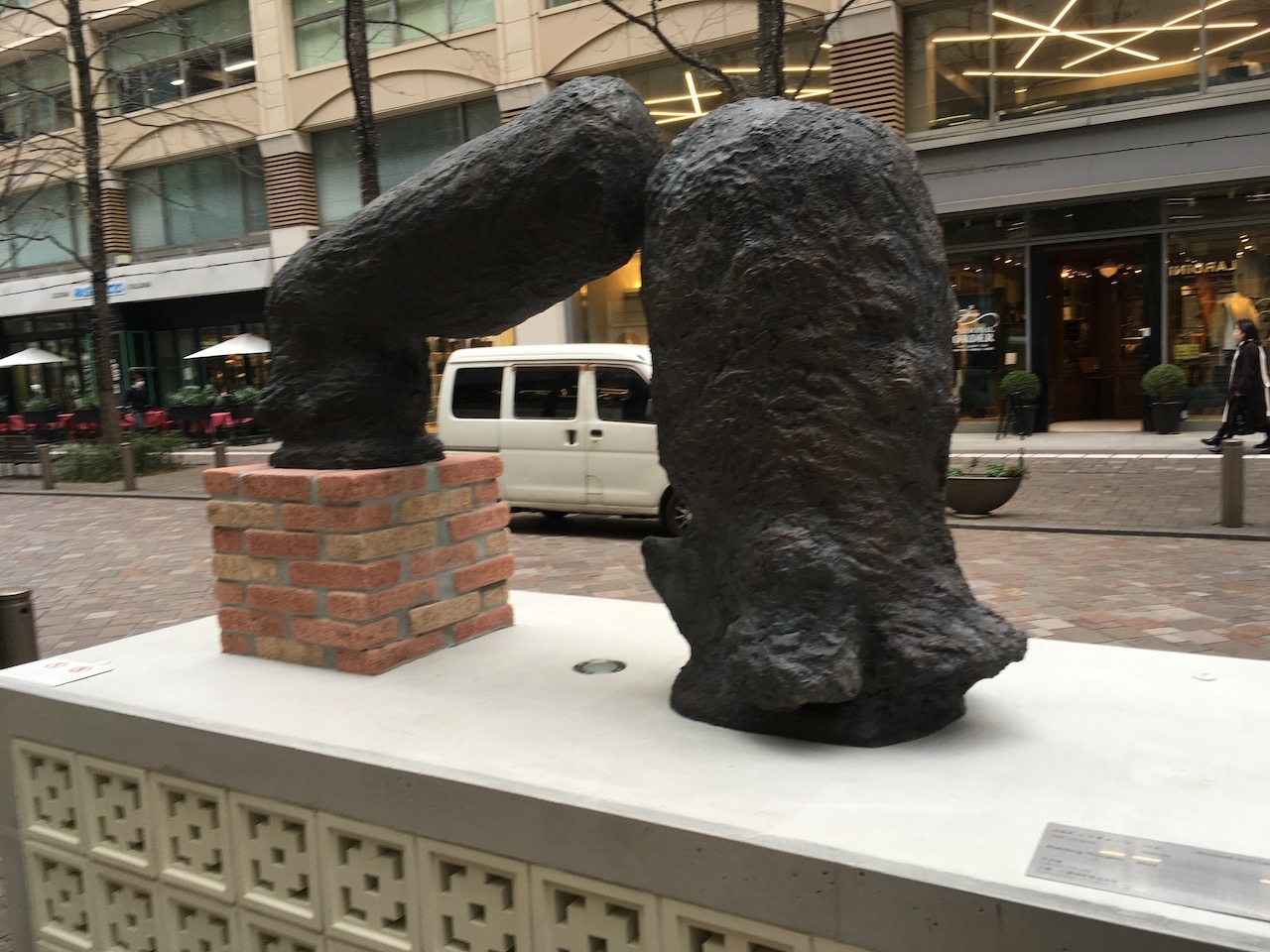 オフィス街のビルの谷間にある通りの両側に、数多くの彫像が設置されています。