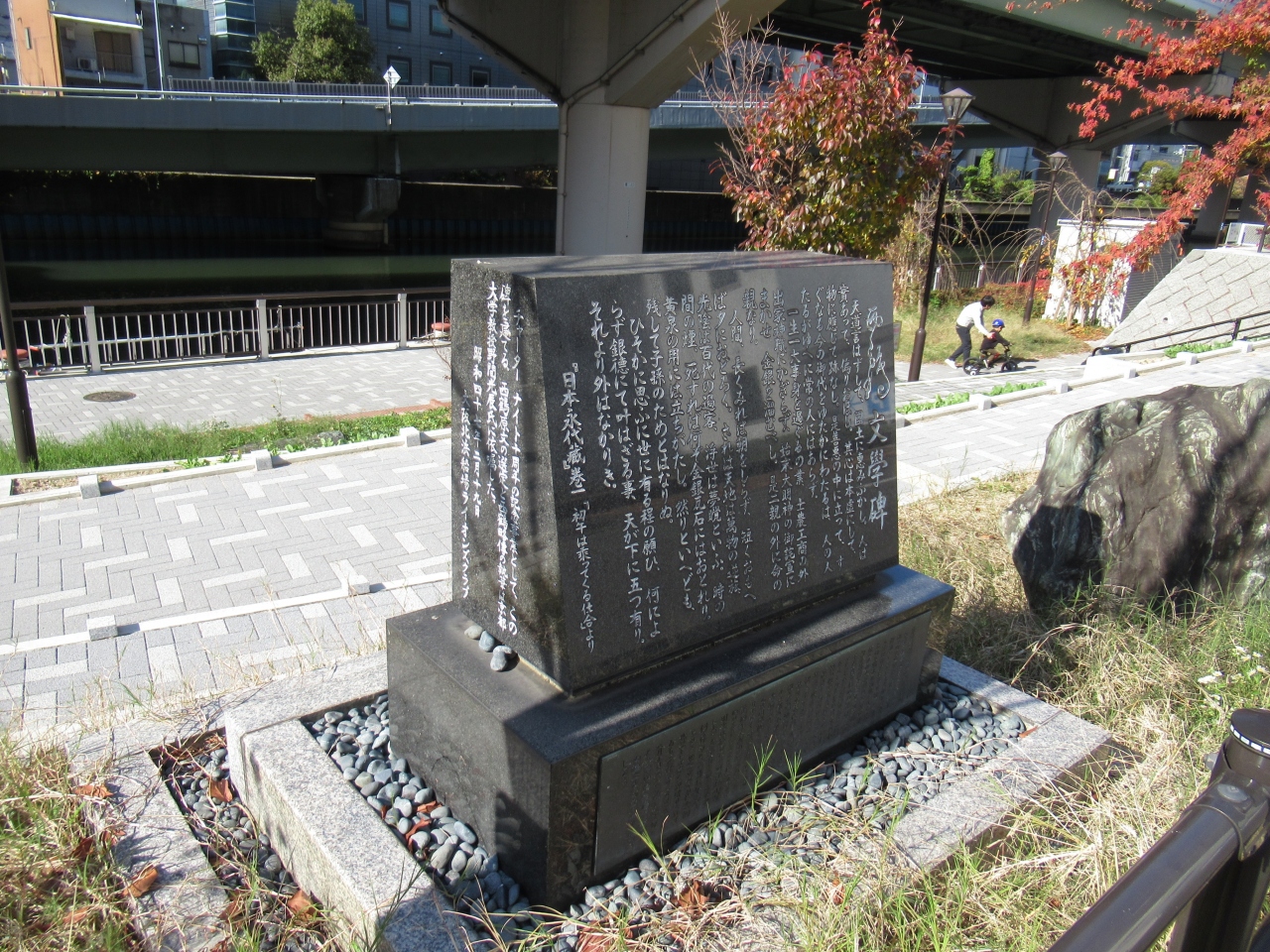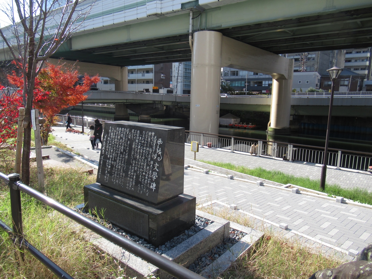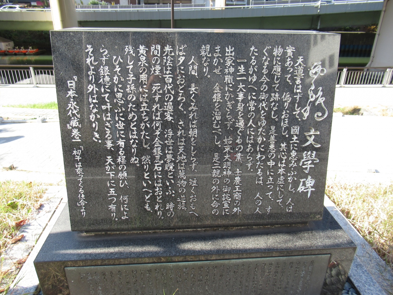 井原西鶴文学碑は、大阪の本町通にある本町橋の東側の通りを東横堀川に沿って北に進んだ場所にあります。