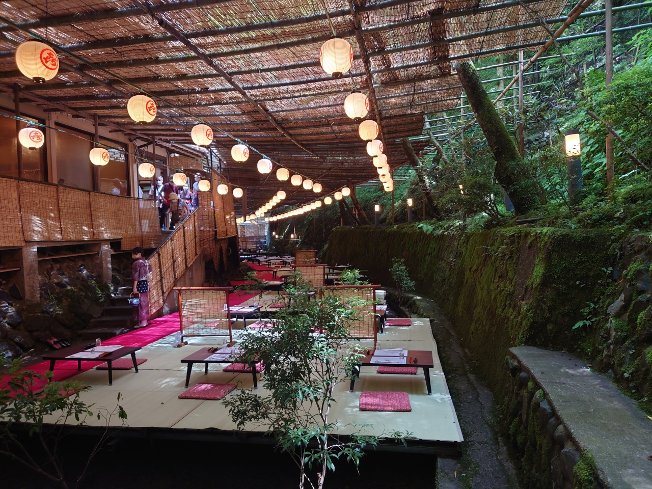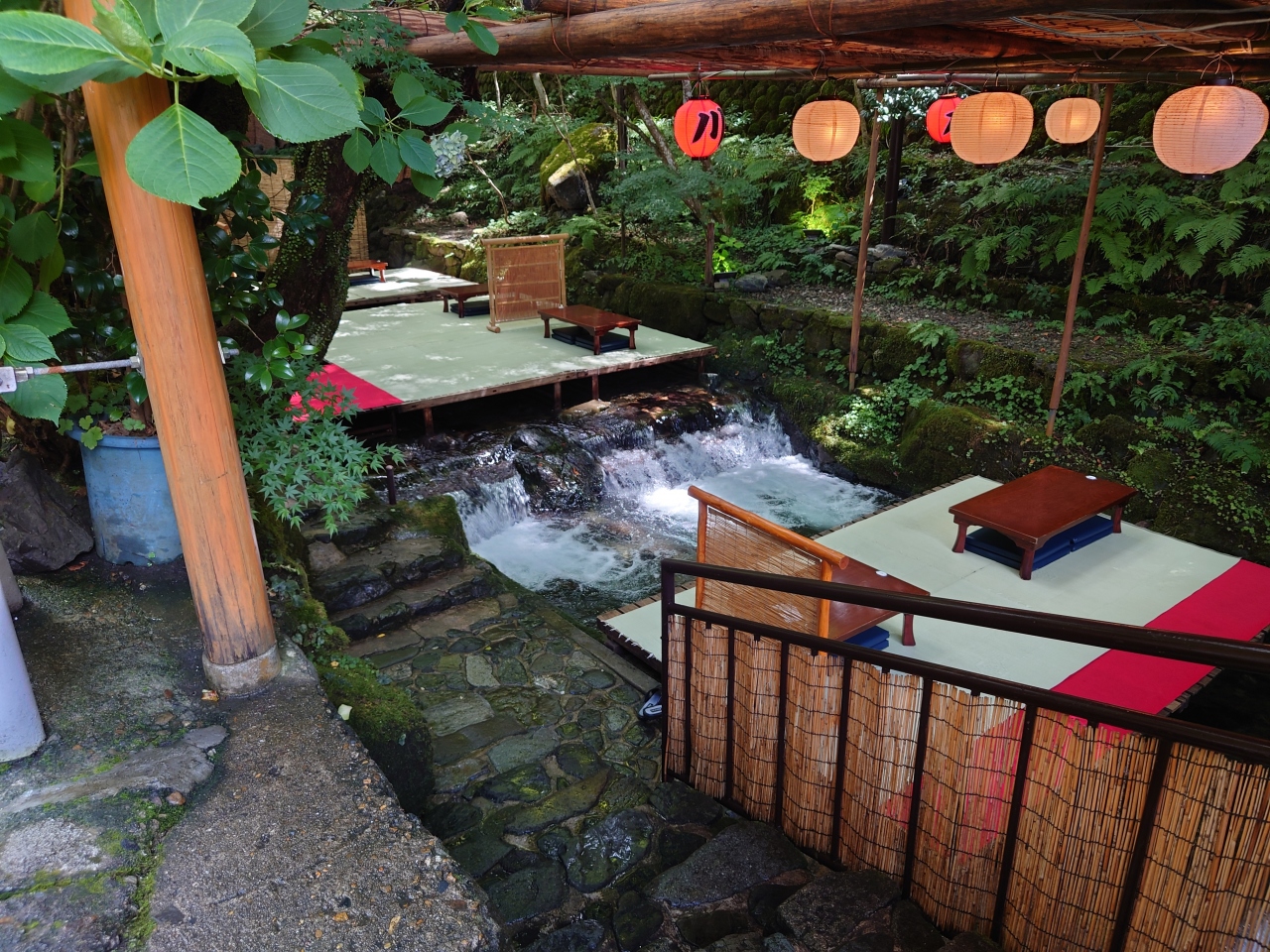 貴船神社の脇の貴船川には川の上に床を敷きそのうえでアユなどの川魚を中心とした料理を食べる川床料理の店が並びます。道路から一段下がった川床は涼しく手を伸ばせば川の水に届きます。川のせせらぎを聞きながら料理を食べるのはなんとも風流です。