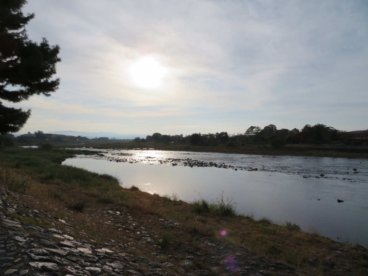 流域によって保津川や大堰川といった名称を持ち、川幅が広くて流れも穏やかな渡月橋付近では桂川と呼ばれています。この流れが京都の町へ入ると鴨川と名称が変わります。両岸に公園、そして川に沿ってサイクリングロードがあり、のんびりと散歩を楽しんでいる人がたくさんいました。