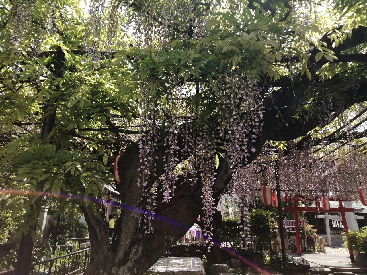 徳王稲荷社と金刀比羅社の2社を合祀しています。昨年、香川の金刀比羅宮を参拝してきたのでより身近に感じてしまいます。この神社は東海道一とも言われる“長藤”で知られており、今年も見学に行って来ました。しかーし、一週間遅かった…。満開は過ぎ、散り始めでした。しかしいくつかはきれいな状態でまさに見頃。好天にも恵まれ、まずまずの藤見ができました。