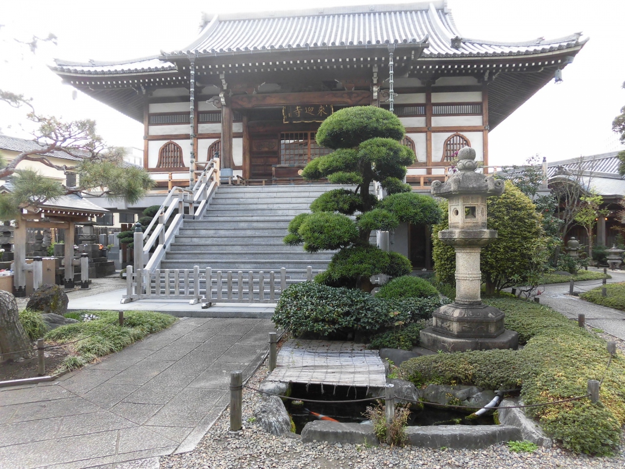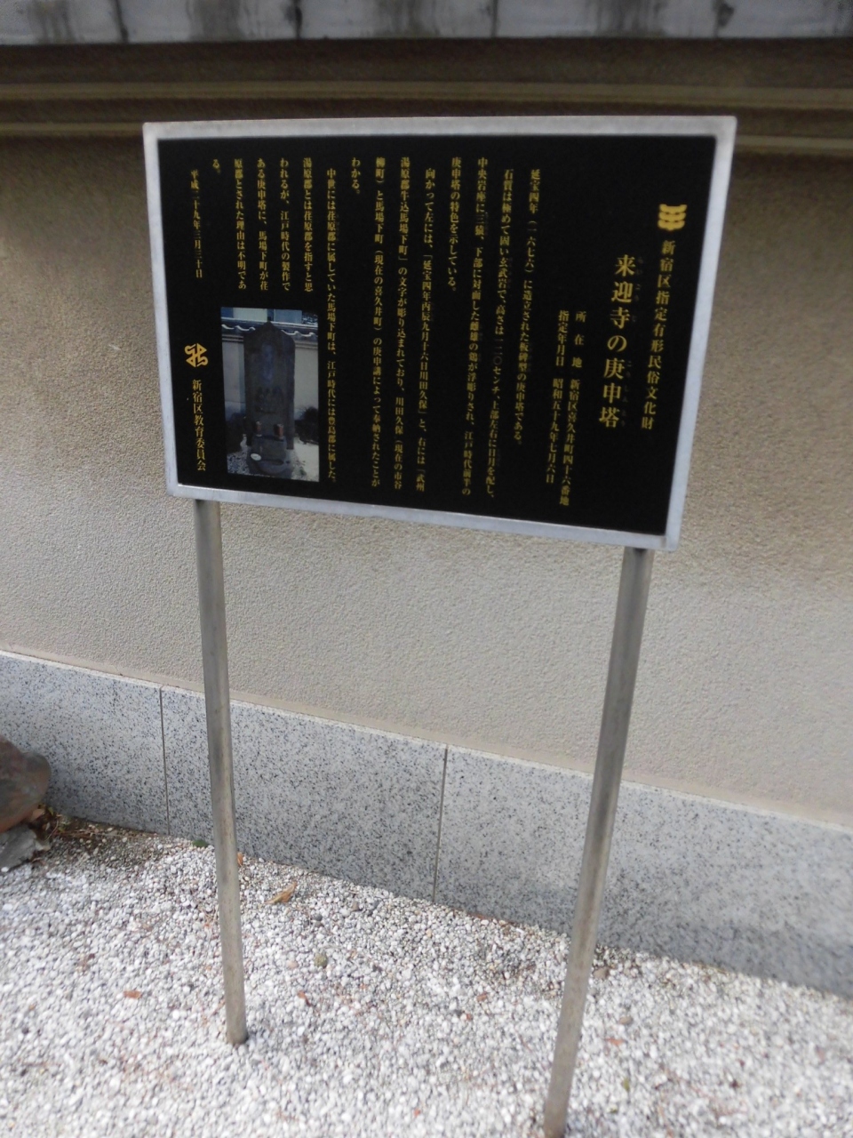 新宿区喜久井町周辺のお寺巡りをしていた時に立ち寄りました。まず目を引いたのが、山門に向かって一直線に伸びている参道でした。用側が瓦を乗せた塀で囲っていて、石畳の道がきれいに整備されていました。境内に入ると手入れの行き届いた植栽と、立派な本堂がありました。また、今から350年ぐらい前の庚申塔が祀られていて、かなり傷んではいますが、見ざる言わざる聞かざるの3猿らしい姿が刻まれていて、歴史あるお寺ということもわかりました。