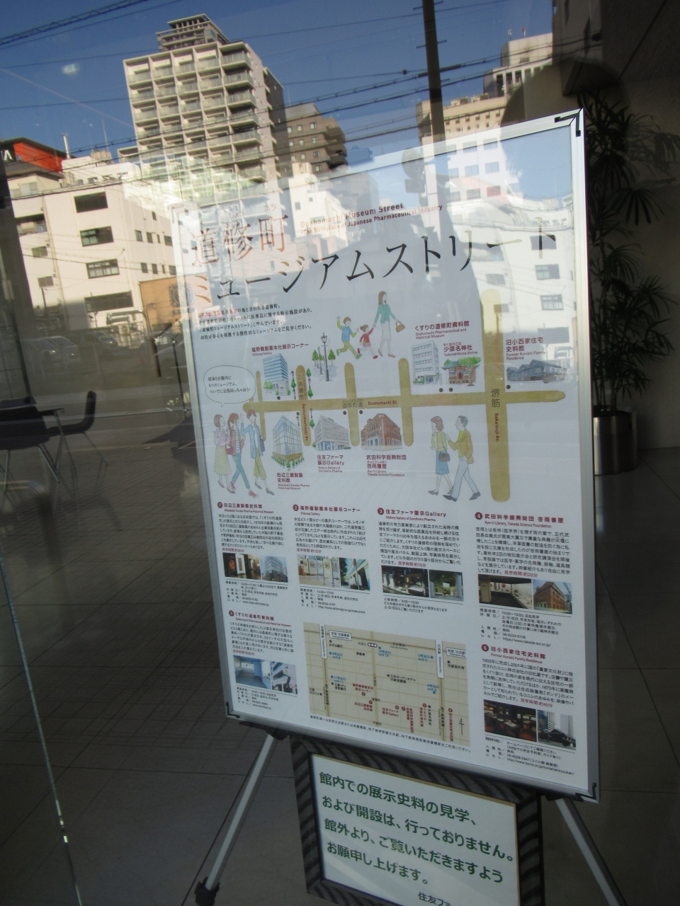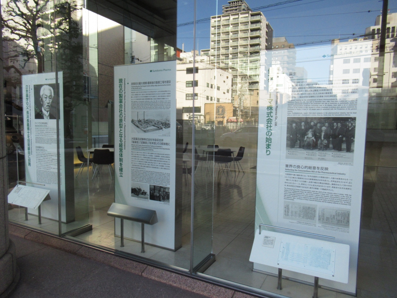 外からもガラス越しに見ることができて、会社の歴史と道修町の歩みが展示されています。