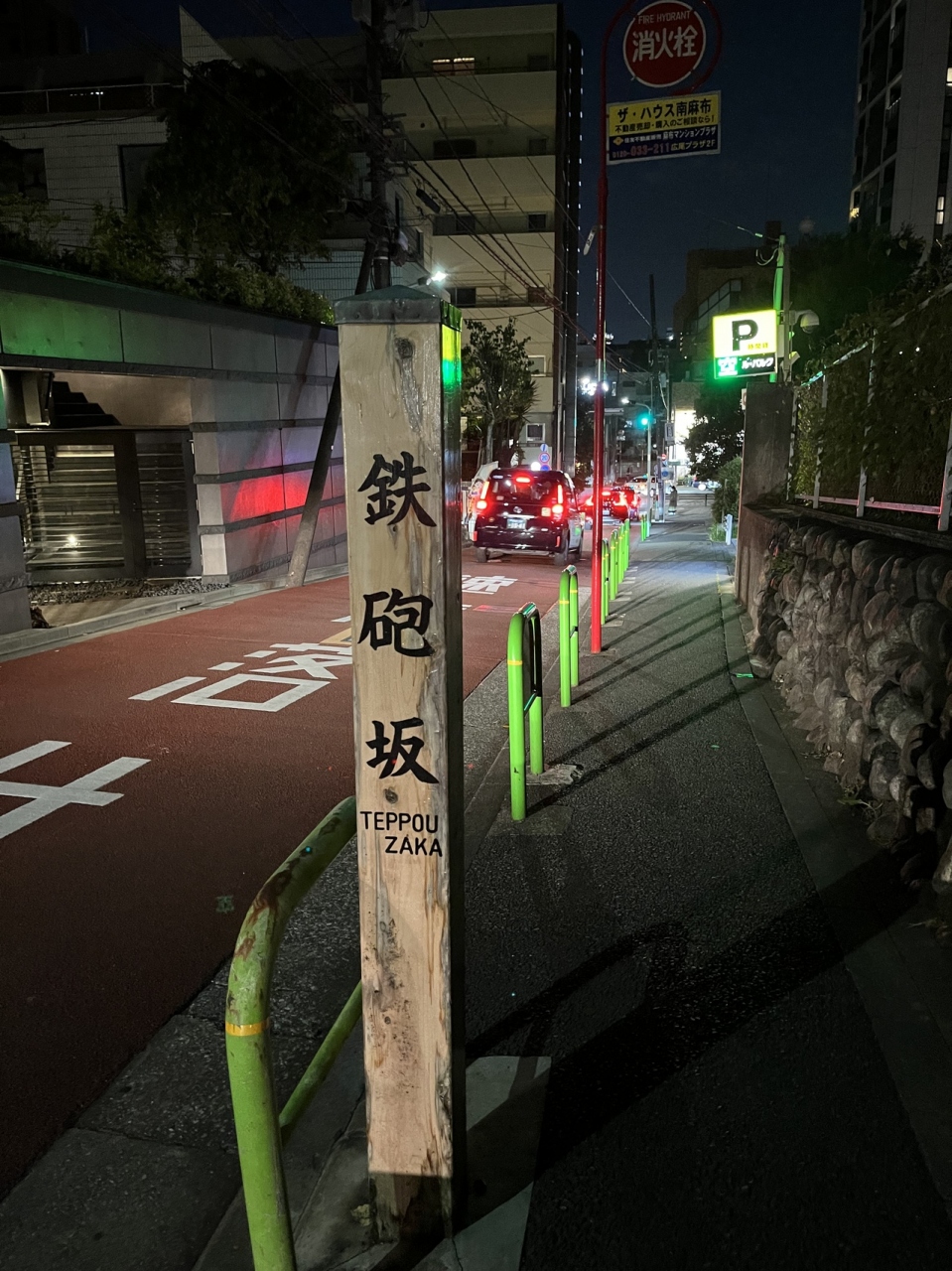 起伏の多い港区の広尾エリアにある坂道のひとつです。北条坂と繋がった短い坂道が鉄砲坂と呼ばれています。外苑西通りに続く坂道ですが、人通りや交通量はそれほど多くありません。江戸時代、幕府の鉄砲練習場があったことからこの名前がついているそうです。