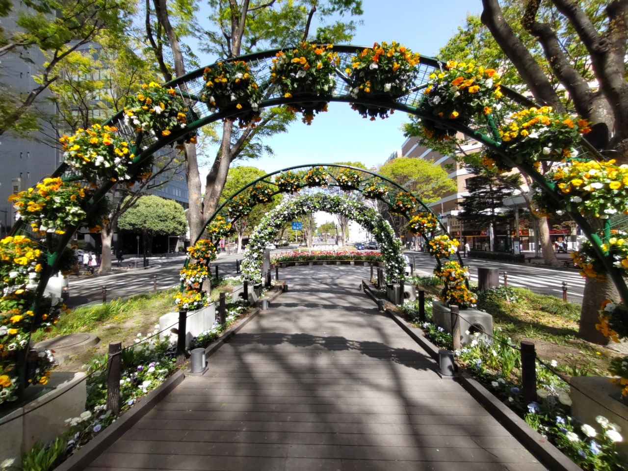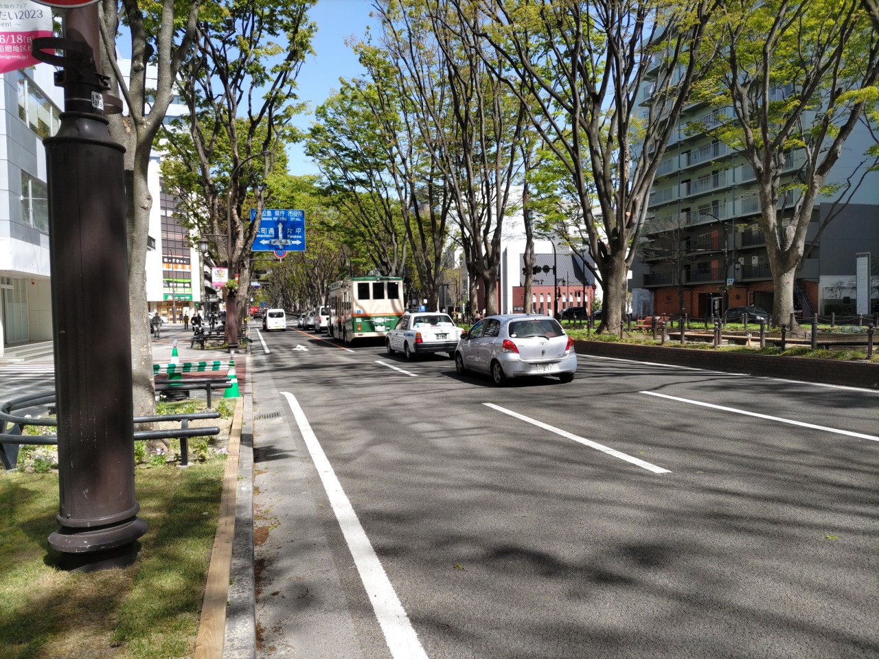 るーぷる仙台の「せんだいメディアテーク」バス停で降りて、定禅寺通りのケヤキ並木を歩いた。約700m続く道路の中央の遊歩道のまわりには、「夏の思い出」などの彫刻や花壇、ベンチが配されていてムード満点、絶好の散策コースである。4月の午後、近くのコンビニでコーヒーを購入し、ベンチに座ってゆったりとしたひと時を過ごした。毎年12月に行われる「SENDAI光のページェント」では、ケヤキの木が美しいイルミネーションで飾られる。何年か前に訪れたときは、大変綺麗だったことが強く印象に残っている。