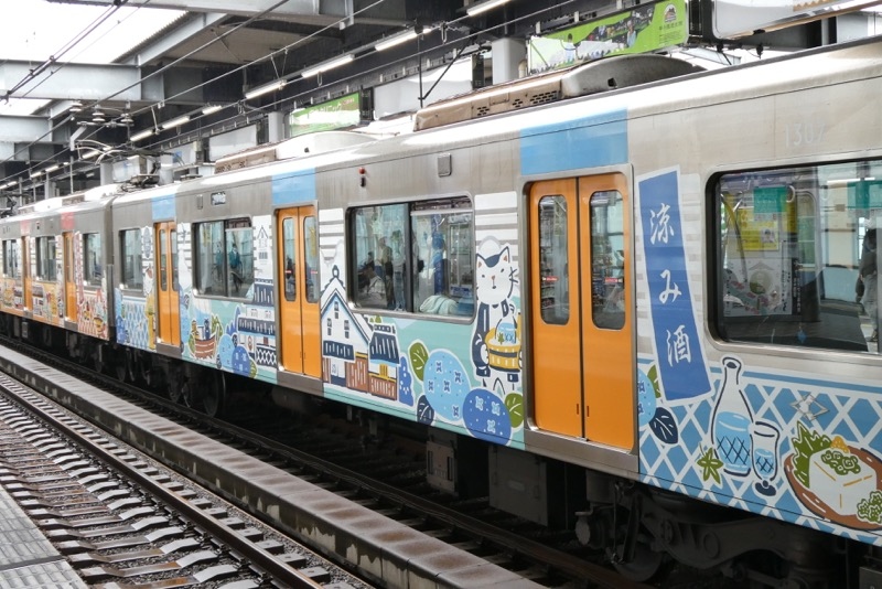 近鉄や山陽電車などが乗り入れていて、今回は奈良まで行くのに利用しました。電車をまっているあいだに、ちょうど向かいのホームに灘五郷のラッピングカーが停車。前回のものよりさらににぎやかなデザインになっているように感じました。今度は乗りたいものです。